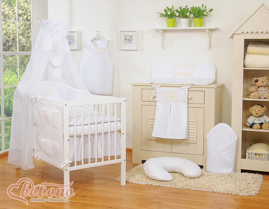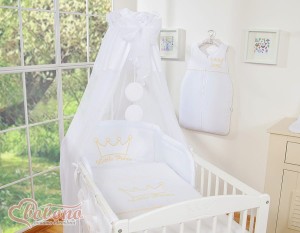 1. Duży baldachim z białego tiulu ze wstawka z bawełny 155x270cm najdłuższy i najszerszy, dzięki czemu można go ładnie ułożyć wokół łóżeczka, ozdobnie pomarszczyć lub nawet umocować na dłuższym boku łóżeczka. Baldachim jest długi niemal do ziemi, poniżej dolnych szczebelków łóżeczka, nie będzie więc wpadał do wewnątrz nawet przy materacu opuszczonym na najniższym poziomie łóżeczka - jak to się niestety często dzieje przy tańszych pościelach, oszczędnie krojonych. Brzegi baldachimu wykończone piękną gładką satynową lamówką. Baldachim Tiulowy wykonany jest z delikatnego i zwiewnego jak chmurka tiulu, wygląda na łóżeczku niezwykle ozdobnie.