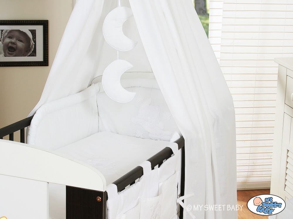 - Wiszące księzyce+ duża gruba kokarda - Dwa wiszące księżyce z miękkim wypełnieniem to słodkie i niepowtarzalne uzupełnienie kompletu pościeli. Idealnie pasują do do haftu z misiem znajdującym się na ochraniaczu, przyciągają uwagę dziecka w pierwszych miesiącach życia skutecznie zastępując karuzelkę. Duża gruba kokarda stanowi piękne zwieńczenie całości.