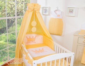 1. Duży baldachim bawełniany 160x250 cm najdłuższy i najszerszy, dzięki czemu można go ładnie ułożyć wokół łóżeczka, ozdobnie pomarszczyć lub nawet umocować na dłuższym boku łóżeczka. Baldachim jest długi niemal do ziemi, poniżej dolnych szczebelków łóżeczka, nie będzie więc wpadał do wewnątrz nawet przy materacu opuszczonym na najniższym poziomie łóżeczka - jak to się niestety często dzieje przy tańszych pościelach, oszczędnie krojonych. Baldachim z tkaniny wykonany jest z tkaniny 100% bawełnianej, posiadającej atest Okotex lub TUV.