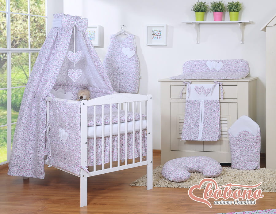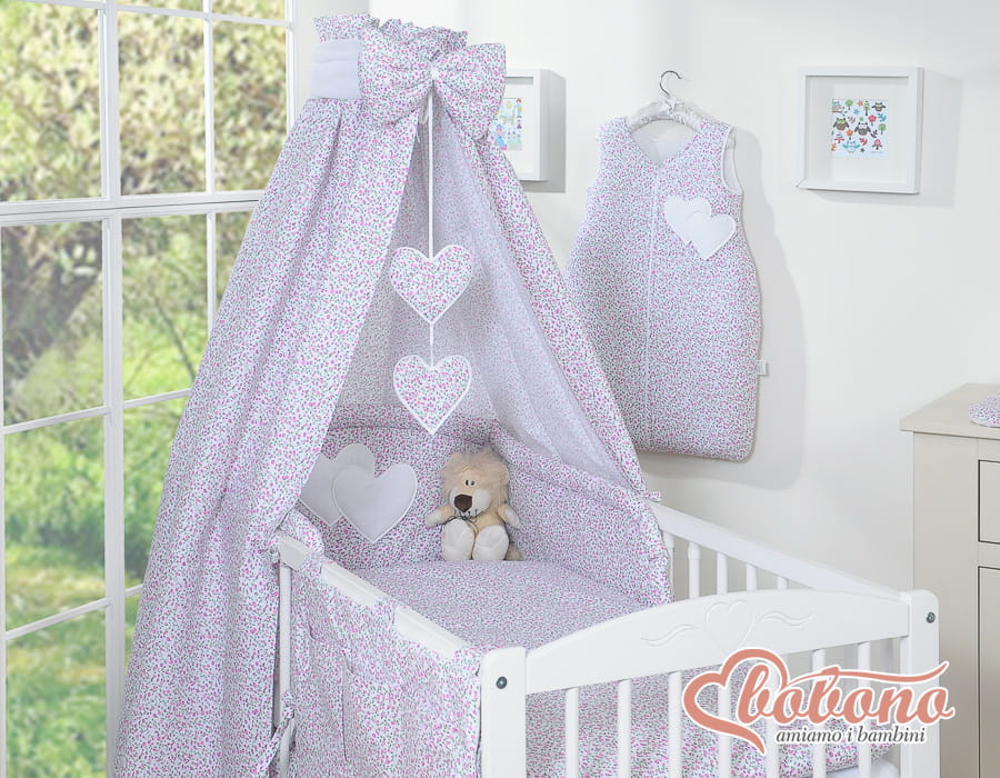 + Wiszące dwa serduszka+duża gruba kokarda - Dwa wiszące serduszka z miękkim wypełnieniem. Przyciągają uwagę dziecka w pierwszych miesiącach życia skutecznie zastępując karuzelkę. Duża gruba kokarda stanowi piękne zwieńczenie całości.