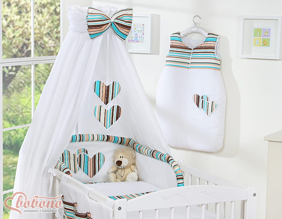 + Wiszące dwa serduszka+duża gruba kokarda - Dwa wiszące serduszka z miękkim wypełnieniem. Przyciągają uwagę dziecka w pierwszych miesiącach życia skutecznie zastępując karuzelkę. Duża gruba kokarda stanowi piękne zwieńczenie całości.