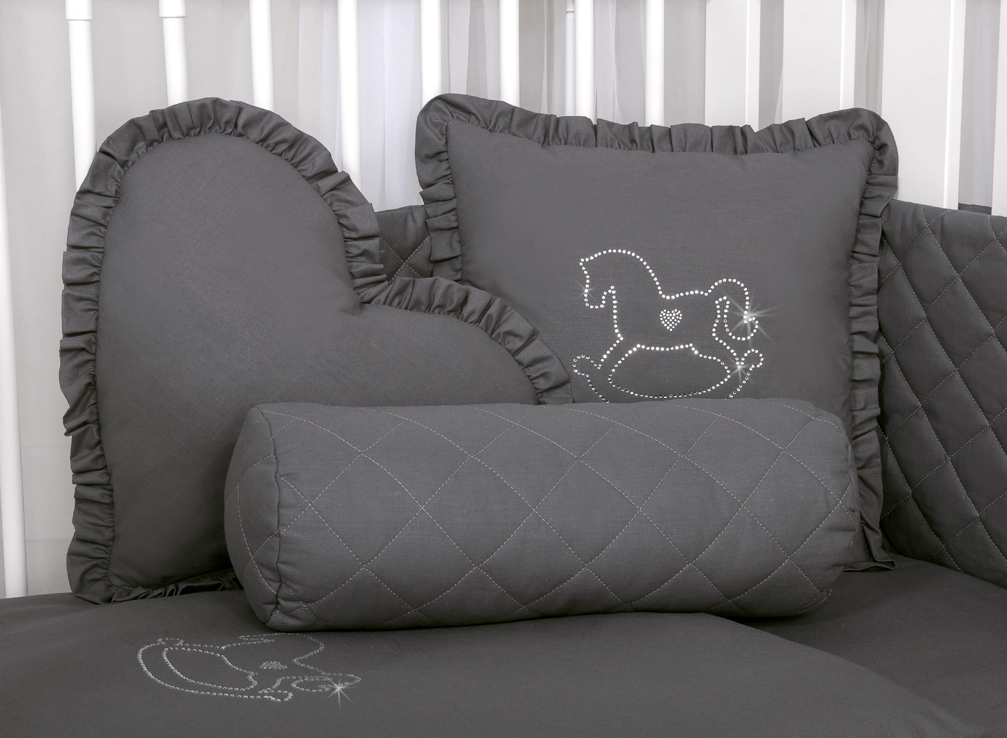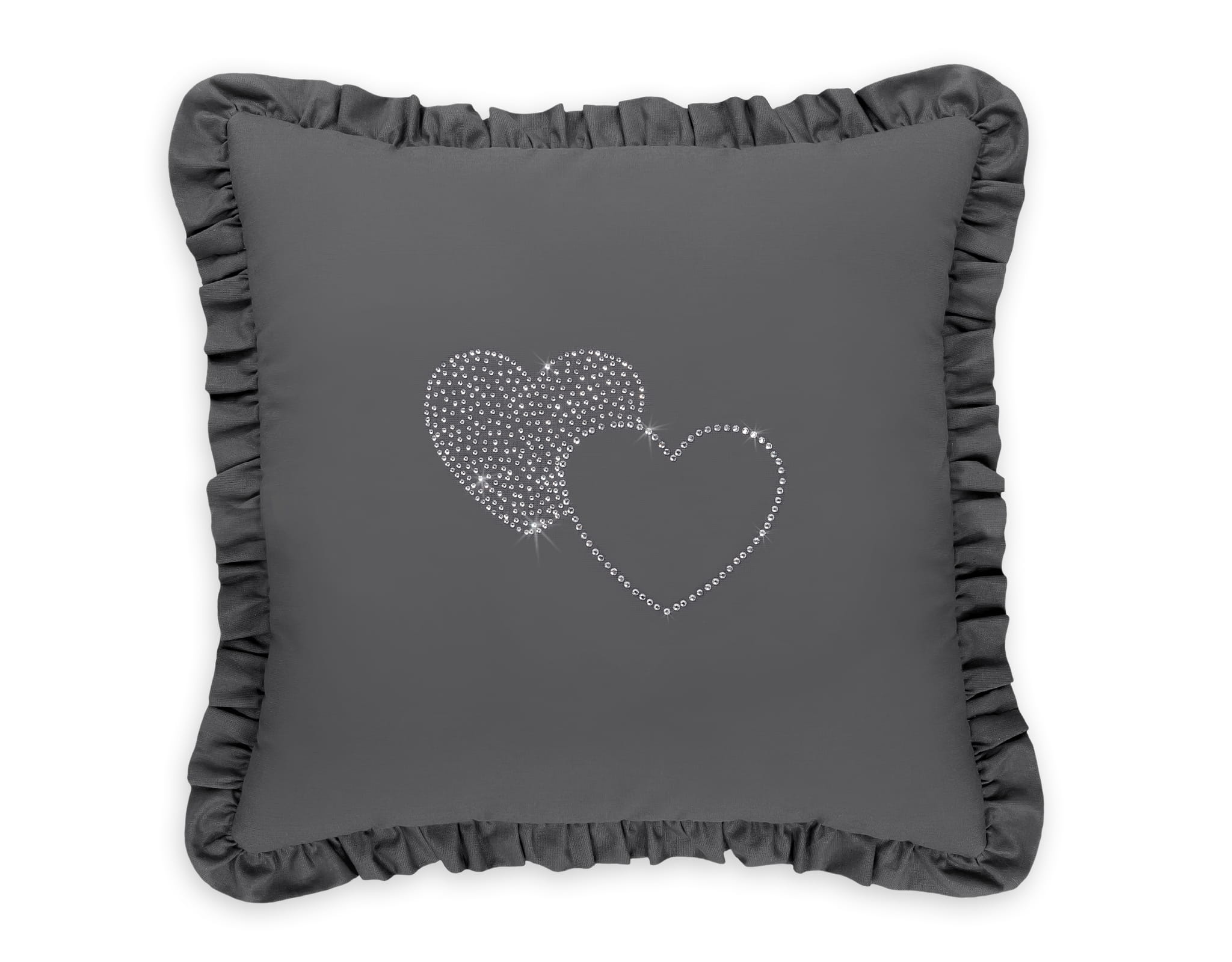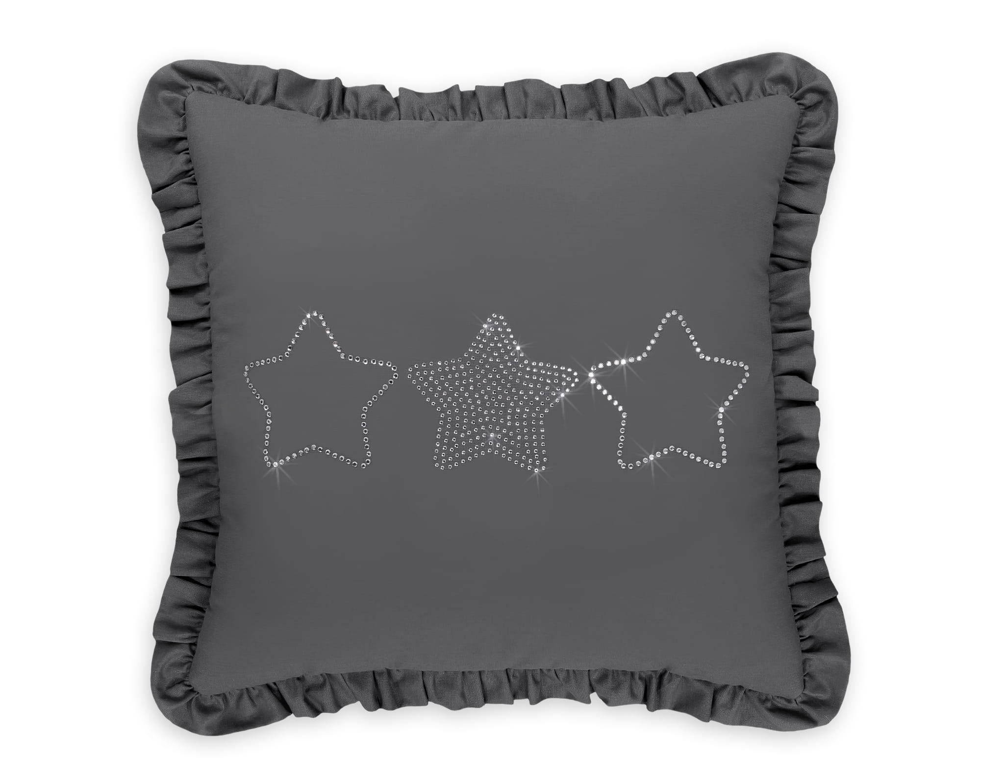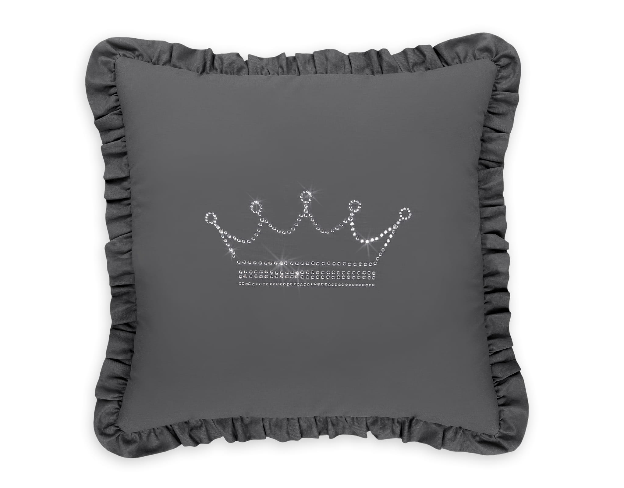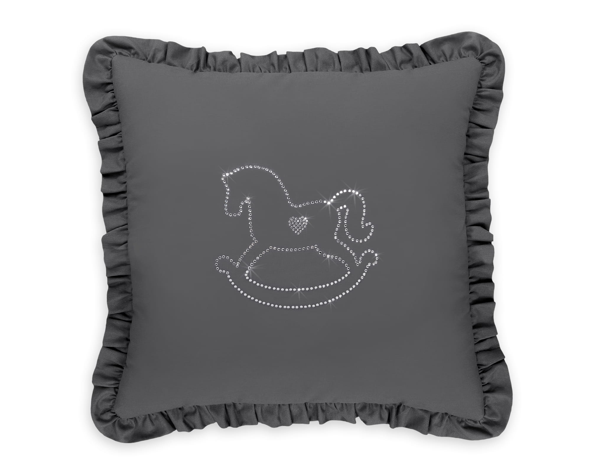 Elegancka kwadratowa poduszka, ozdobiona falbanką. Poszewka przyciąga wzrok migotliwą aplikacją wykonaną z drobnych cyrkonii na gładkiej tkaninie bawełnianej. Wypełniona tzw. sztucznym puchem, antyalergicznym. Sprawdzi się doskonałe jako dekoracja pokoju dziecięcego. Poduszka stanowi całość- poszewka nie jest rozbieralna. Stanowi piękny komplet z naszymi zestawami pościeli.