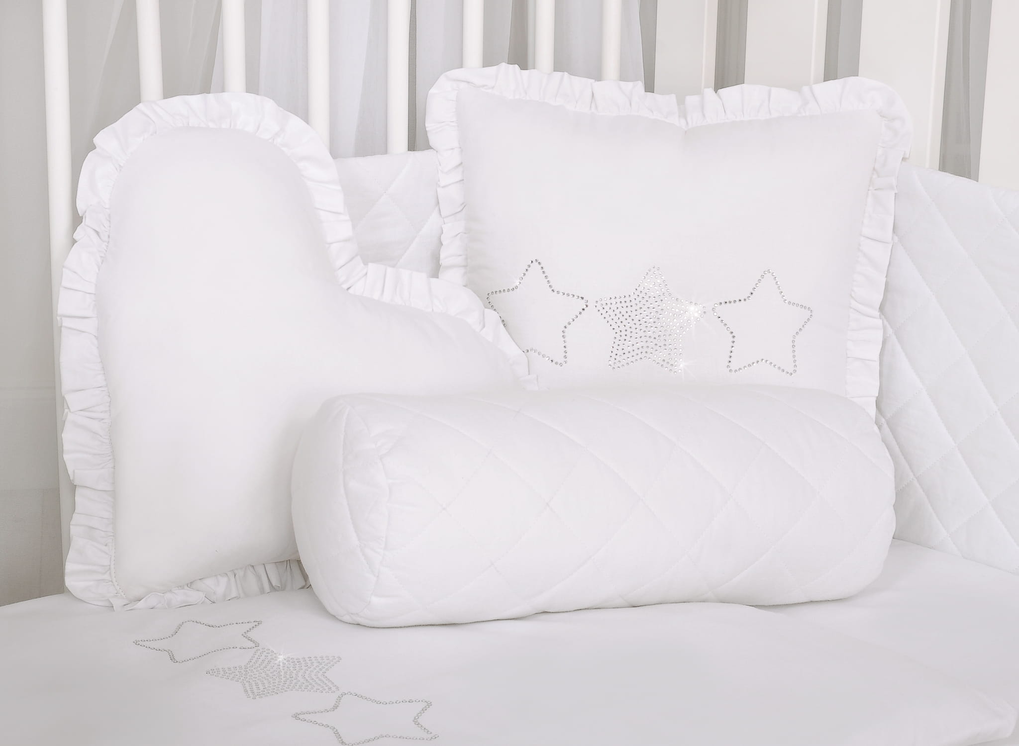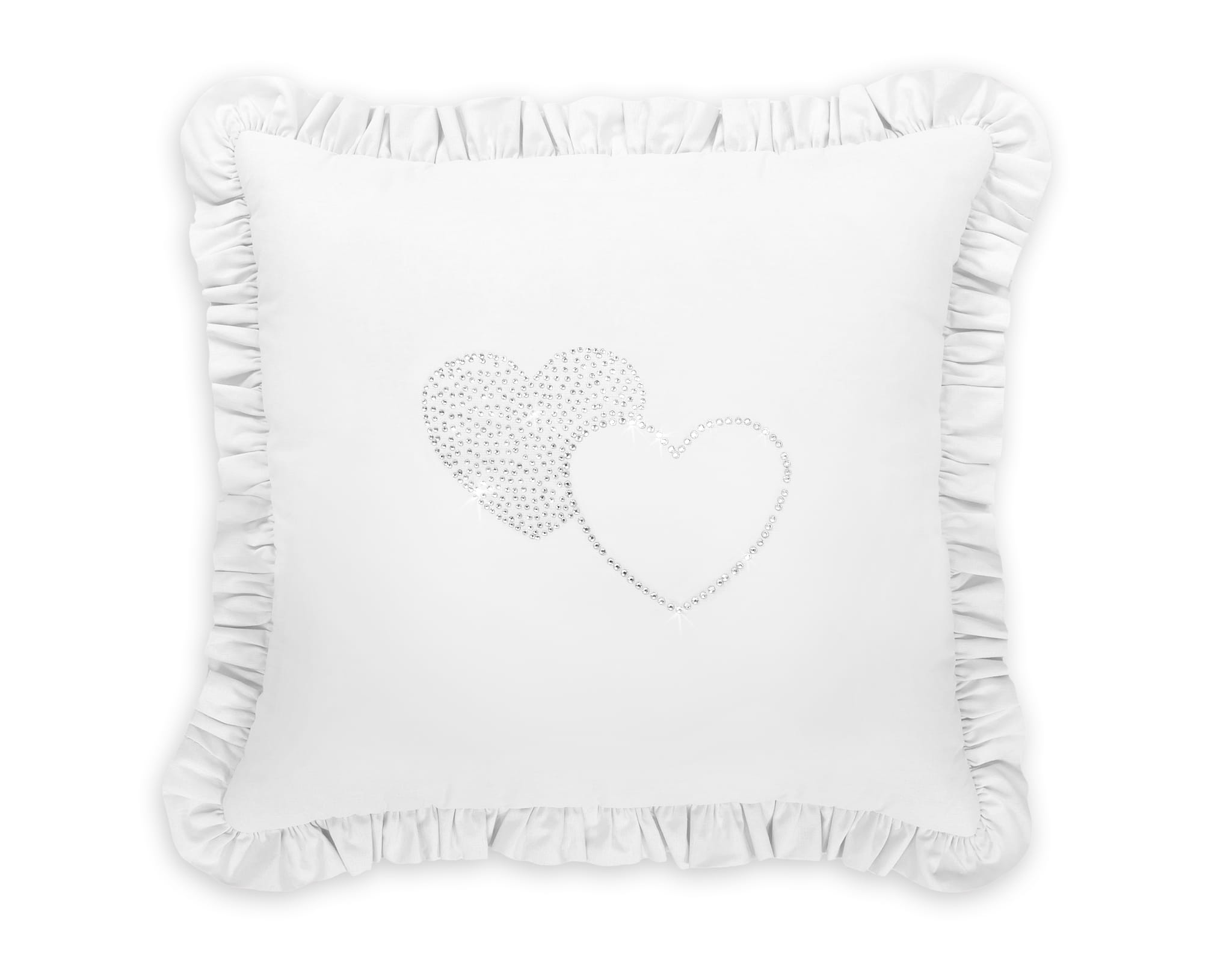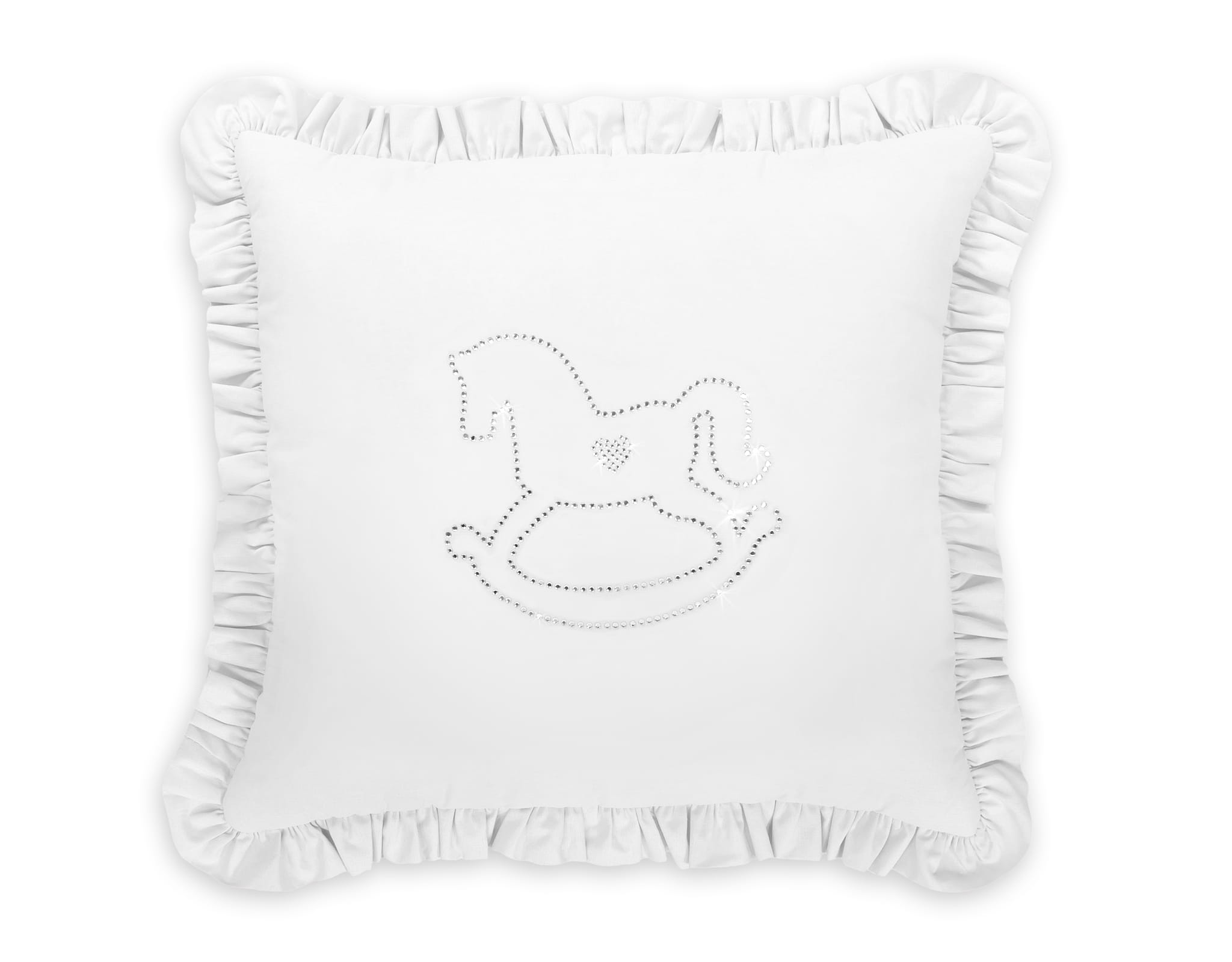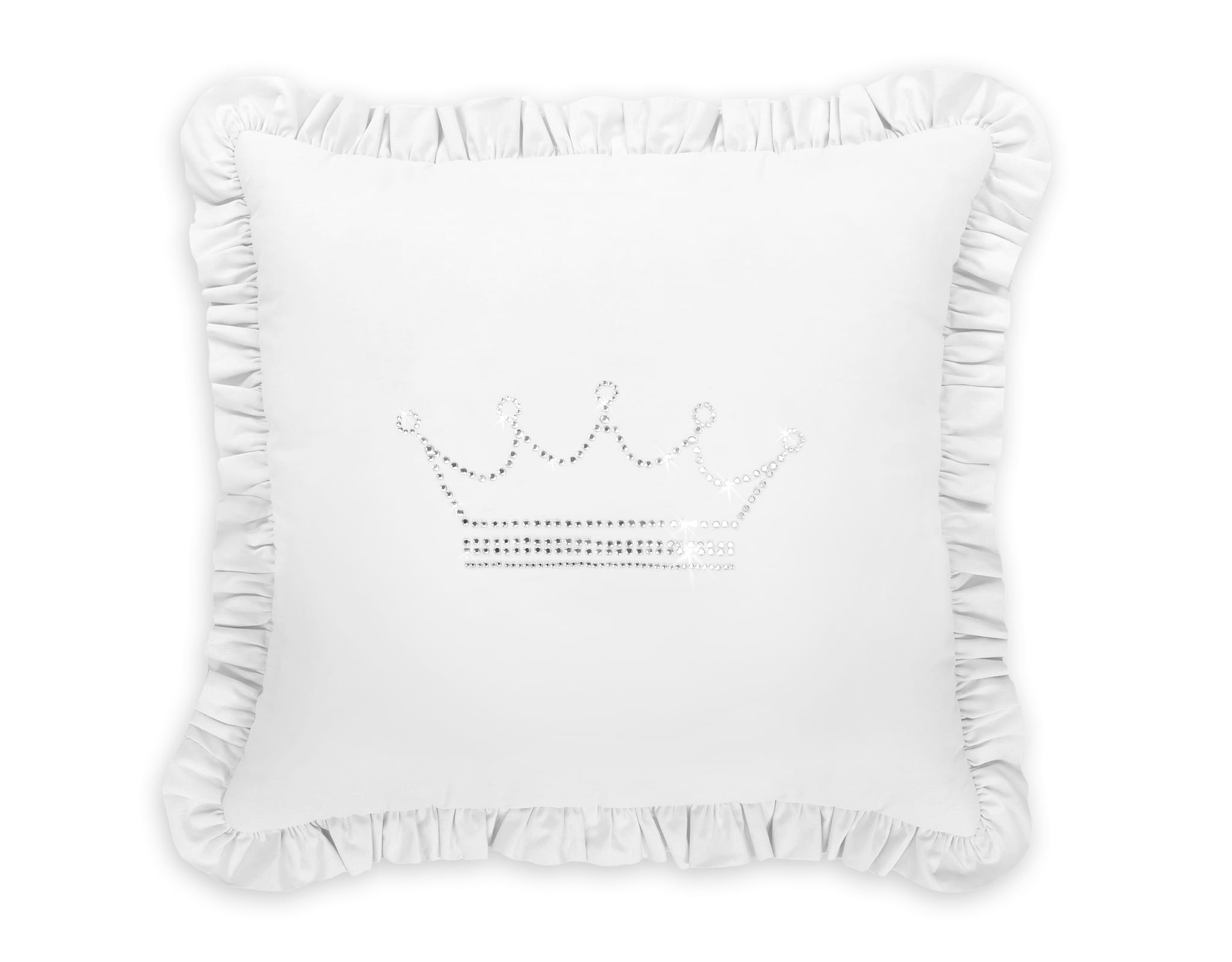 Elegancka kwadratowa poduszka, ozdobiona falbanką. Poszewka przyciąga wzrok migotliwą aplikacją wykonaną z drobnych cyrkonii na gładkiej tkaninie bawełnianej. Wypełniona tzw. sztucznym puchem, antyalergicznym. Sprawdzi się doskonałe jako dekoracja pokoju dziecięcego. Poduszka stanowi całość- poszewka nie jest rozbieralna. Stanowi piękny komplet z naszymi zestawami pościeli.