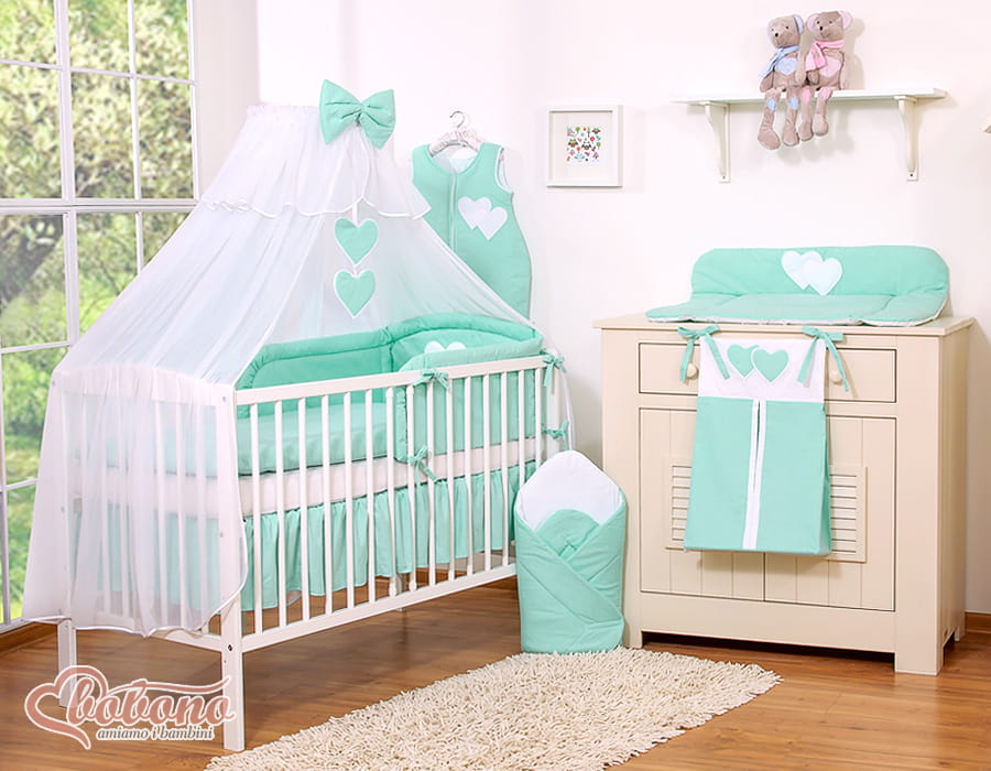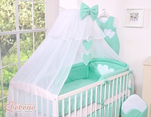 Duża moskitiera do łóżeczka dziecięcego z białego szyfonu z serduszkami i kokardką - miętowe