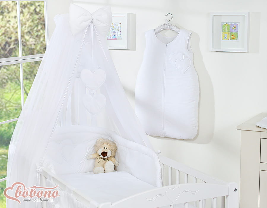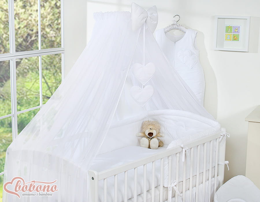 Duża moskitiera do łóżeczka dziecięcego z szyfonu z wiszącymi serduszkami i kokardką - biała