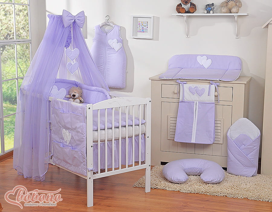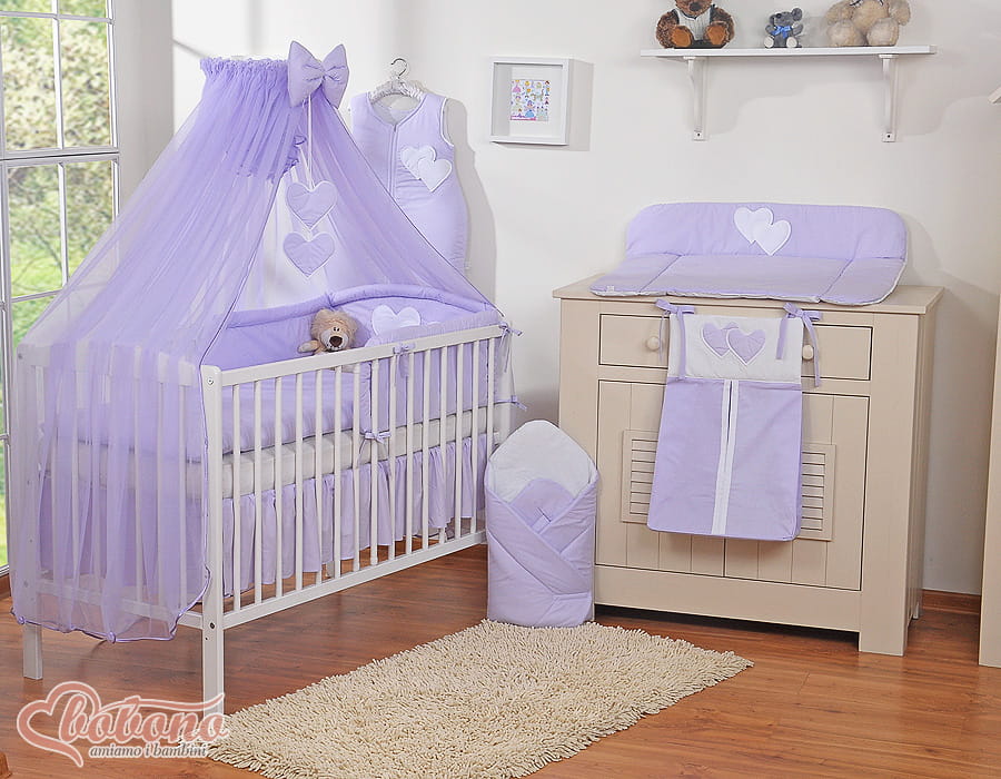 Duża moskitiera do łóżeczka dziecięcego z szyfonu z wiszącymi serduszkami i kokardką - fioletowa