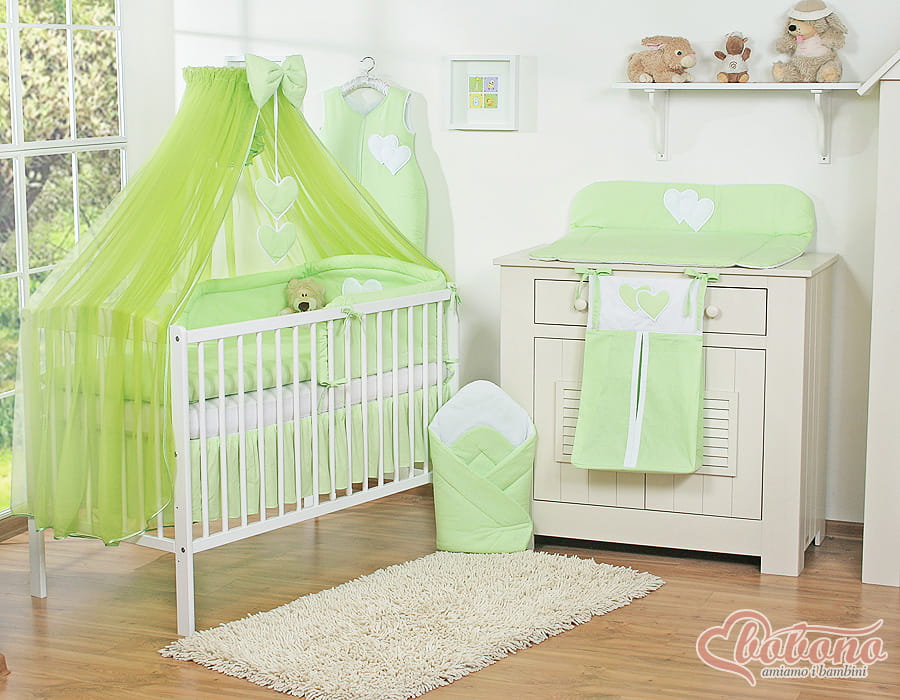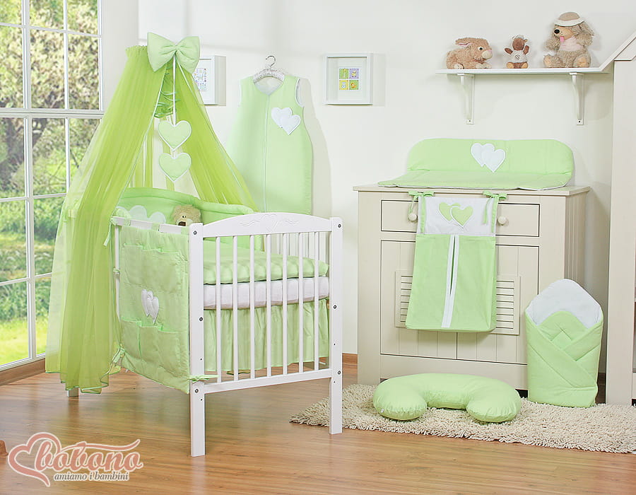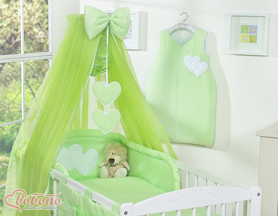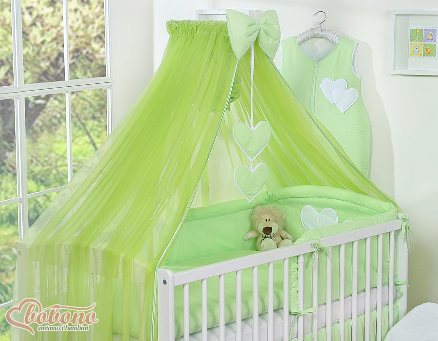 Duża moskitiera do łóżeczka dziecięcego z szyfonu z wiszącymi serduszkami i kokardką - zielona