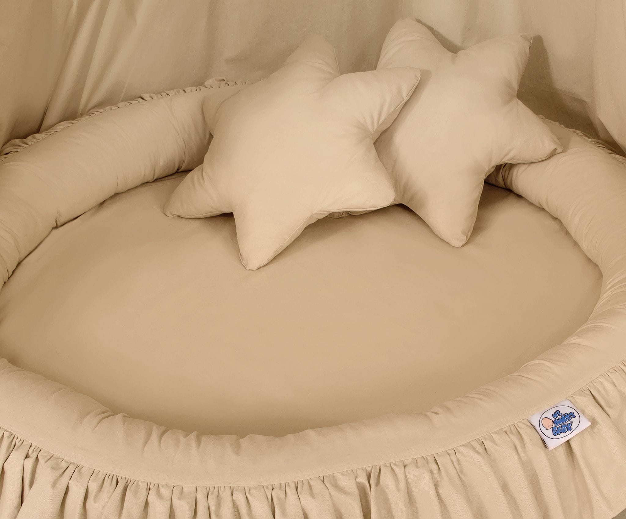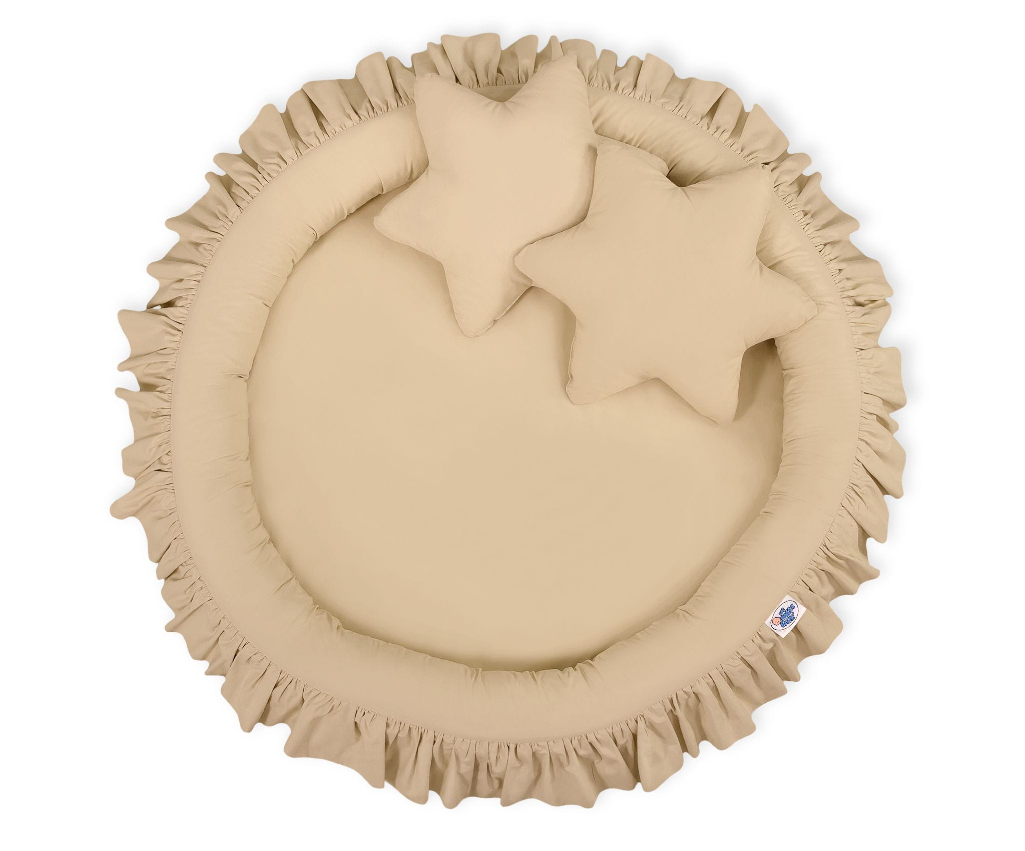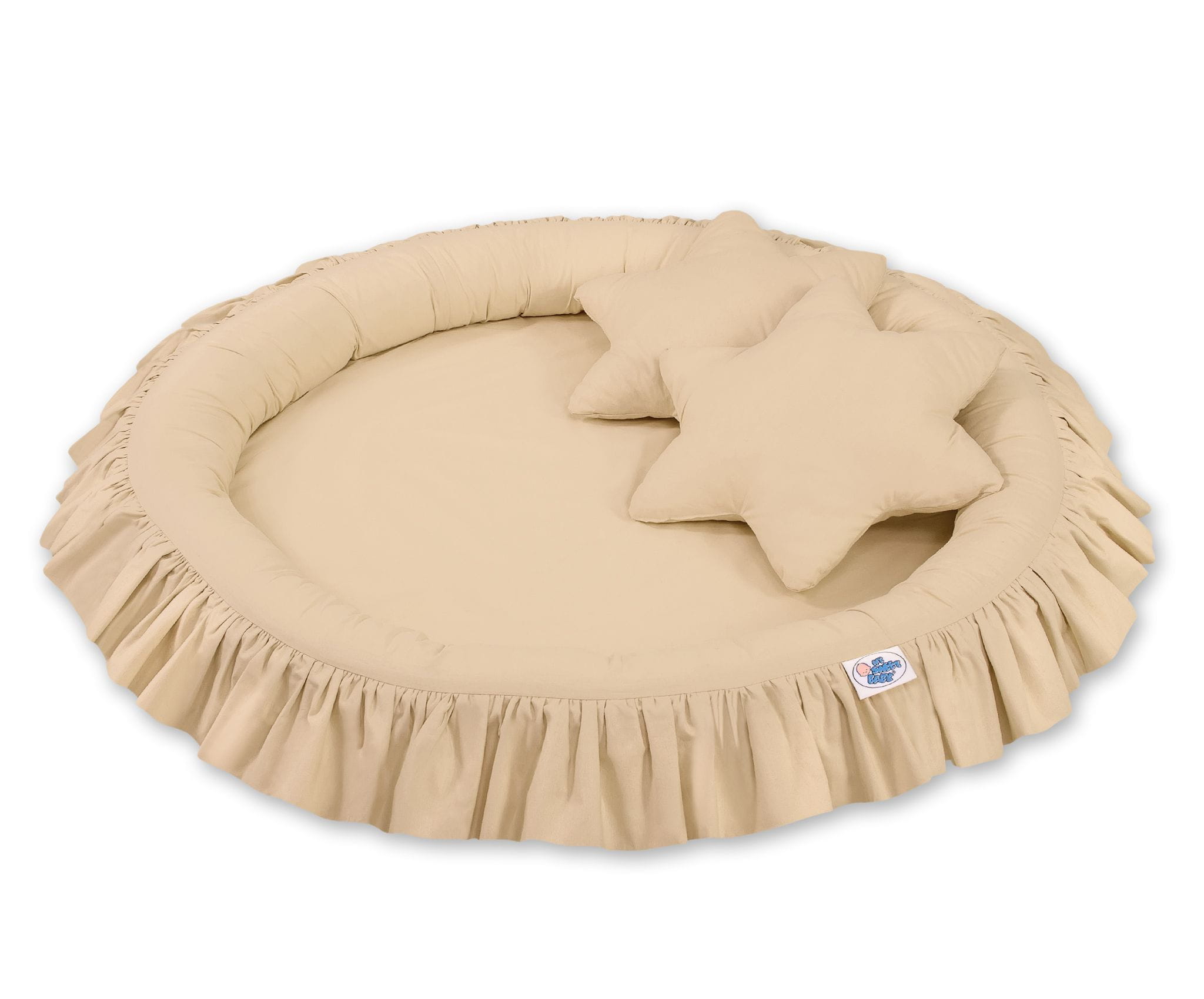Oryginalne gniazdko z falbanką. Funkcjonalne i praktyczne. Doskonale sprawdzi się jako mini basenik, mata do zabawy lub "podłoga" baldachimu. Szerokie, okrągłe i mięciutkie ścianki zapewnią bezpieczną i udaną zabawę dla każdego malucha. Gniazdko może być używane już od pierwszych dni życia jako wygodny i bezpieczny kokon niemowlęcy a później jako przytulne miejsce do zabawy. Pokrowiec wykonany jest z tkaniny 100% bawełnianej, posiadającej atest Okotex. Boki gniazdka wypełnione są atestowanym włóknem Eco Fillball – mięciutkim włóknem uformowanym w malutkie kuleczki. Dzięki specjalnej technologii produkcji kuleczki te są puszyste i sprężyste, a przy tym w dotyku są miękkie i delikatne jak puch, zapewniają odpowiednią cyrkulację powietrza. Dno gniazdka, to specjalna wkładka wykonana z nowoczesnego antyalergicznego atestowanego surowca. Gniazdko łatwo utrzymać w czystości, pokrowiec jest rozbieralny - można prać w pralce w 30 stopniach.
