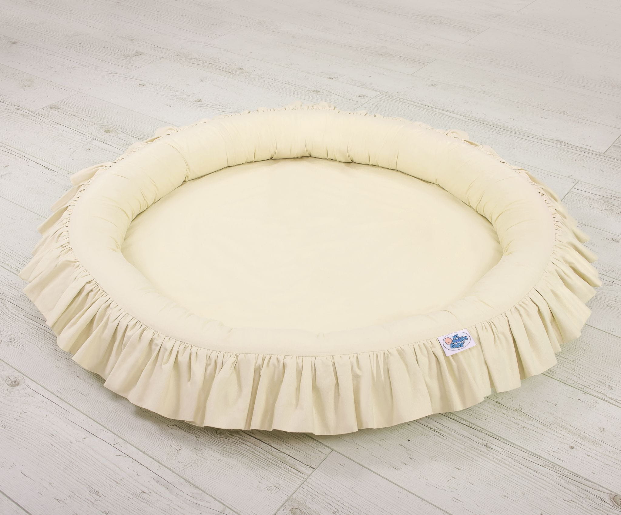 Oryginalne gniazdko z falbanką. Funkcjonalne i praktyczne. Doskonale sprawdzi się jako mini basenik, mata do zabawy lub "podłoga" baldachimu. Szerokie, okrągłe i mięciutkie ścianki zapewnią bezpieczną i udaną zabawę dla każdego malucha. Gniazdko może być używane już od pierwszych dni życia jako wygodny i bezpieczny kokon niemowlęcy a później jako przytulne miejsce do zabawy. Pokrowiec wykonany jest z tkaniny 100% bawełnianej, posiadającej atest Okotex. Boki gniazdka wypełnione są atestowanym włóknem Eco Fillball – mięciutkim włóknem uformowanym w malutkie kuleczki. Dzięki specjalnej technologii produkcji kuleczki te są puszyste i sprężyste, a przy tym w dotyku są miękkie i delikatne jak puch, zapewniają odpowiednią cyrkulację powietrza. Dno gniazdka, to specjalna wkładka wykonana z nowoczesnego antyalergicznego atestowanego surowca. Gniazdko łatwo utrzymać w czystości, pokrowiec jest rozbieralny - można prać w pralce w 30 stopniach.