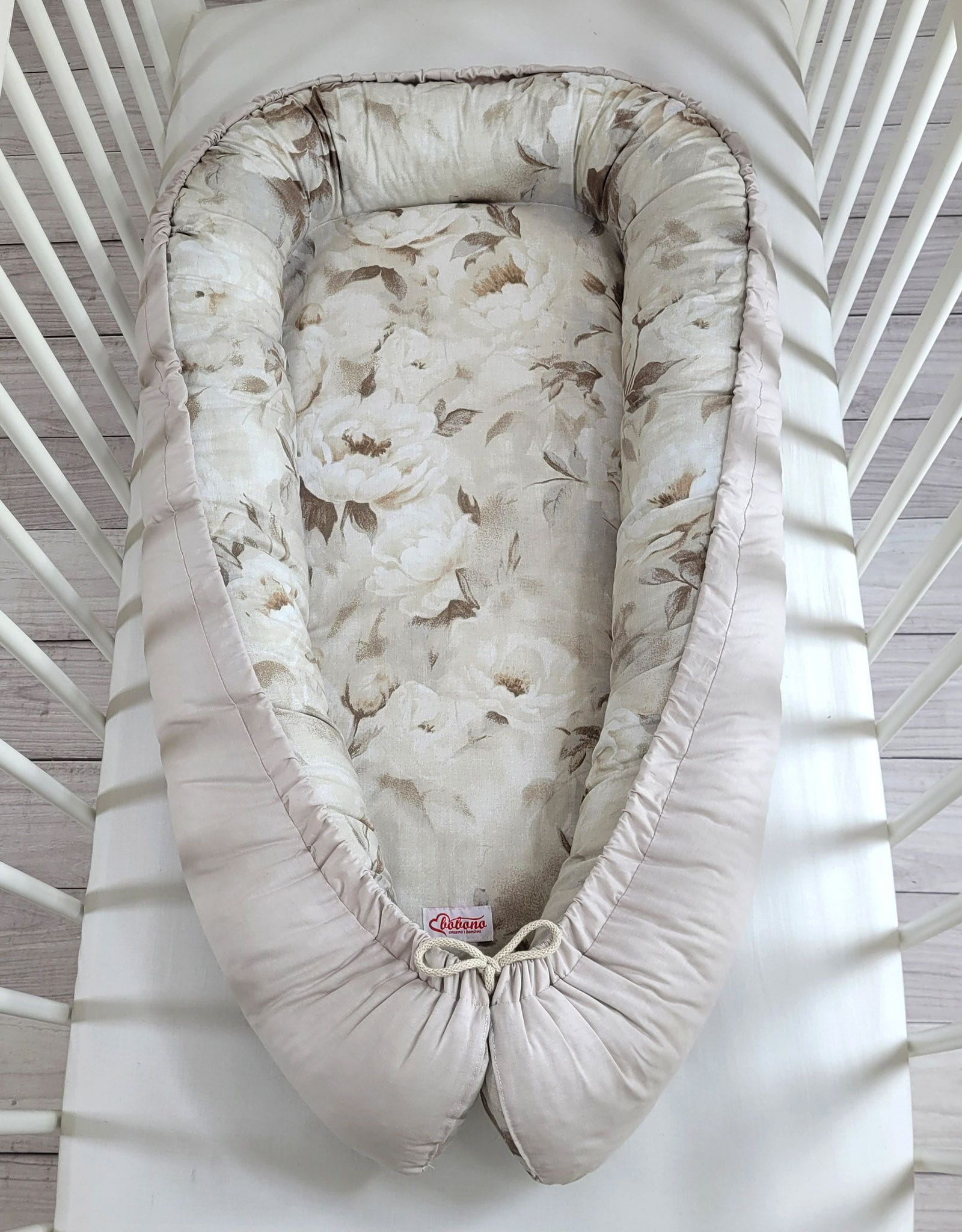 Kokon niemowlęcy dwustronny kojec otulacz Premium BOBONO- Peonies beige/ kamienna szarość