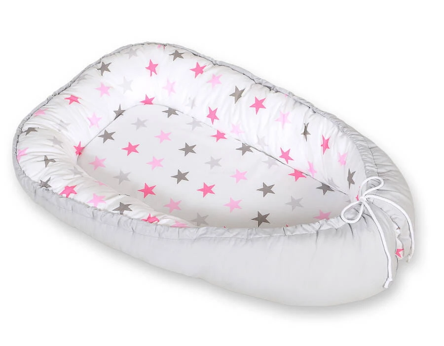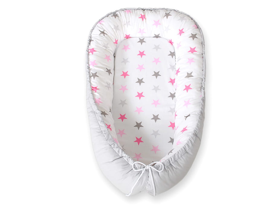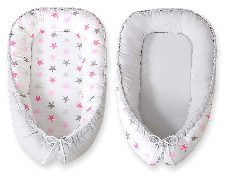 Kokon niemowlęcy dwustronny kojec otulacz Premium BOBONO- gwiazdy różowo-szare/szary