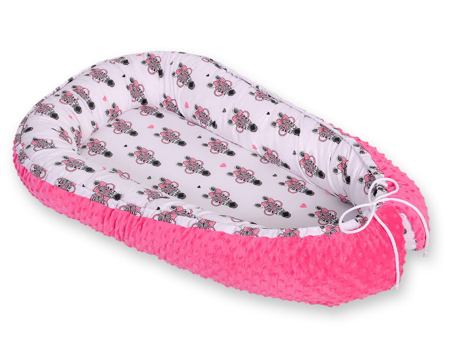 Kokon niemowlęcy dwustronny kojec otulacz Premium BOBONO minky - zebry różowe