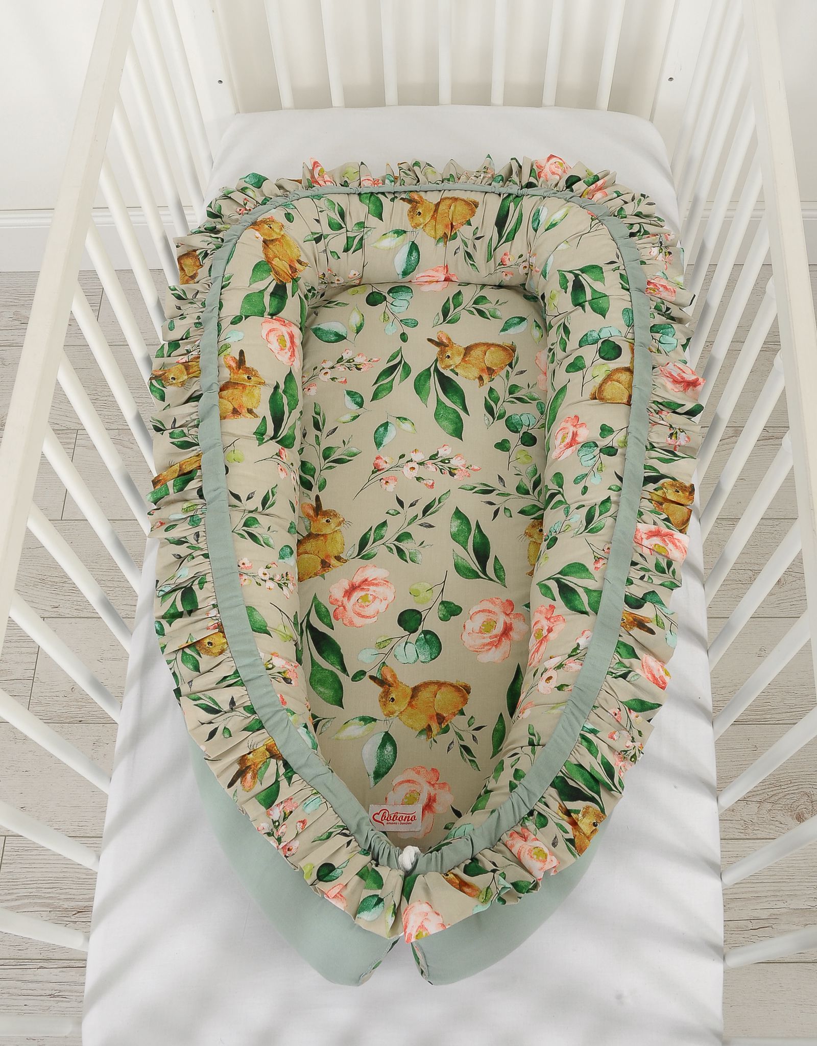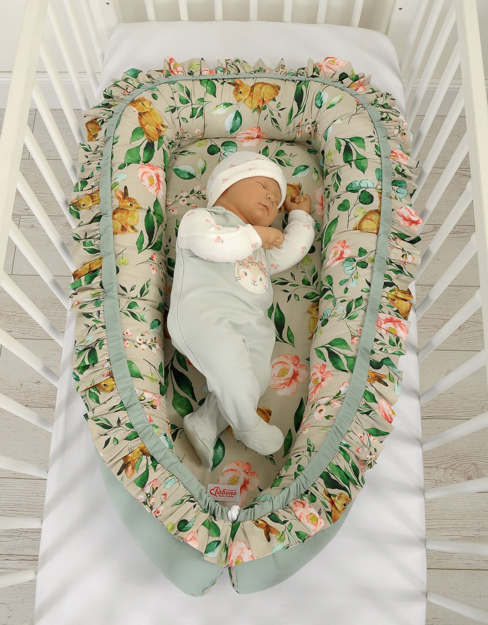Kokon niemowlęcy kojec otulacz Premium z falbanką - Rabbit with flowers