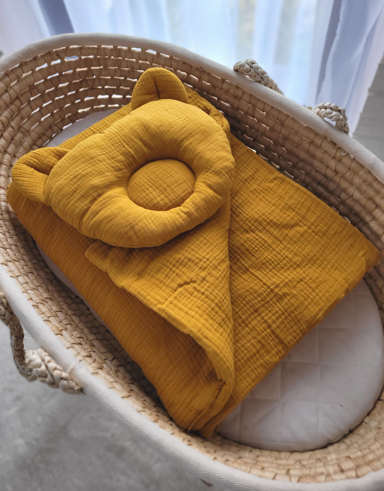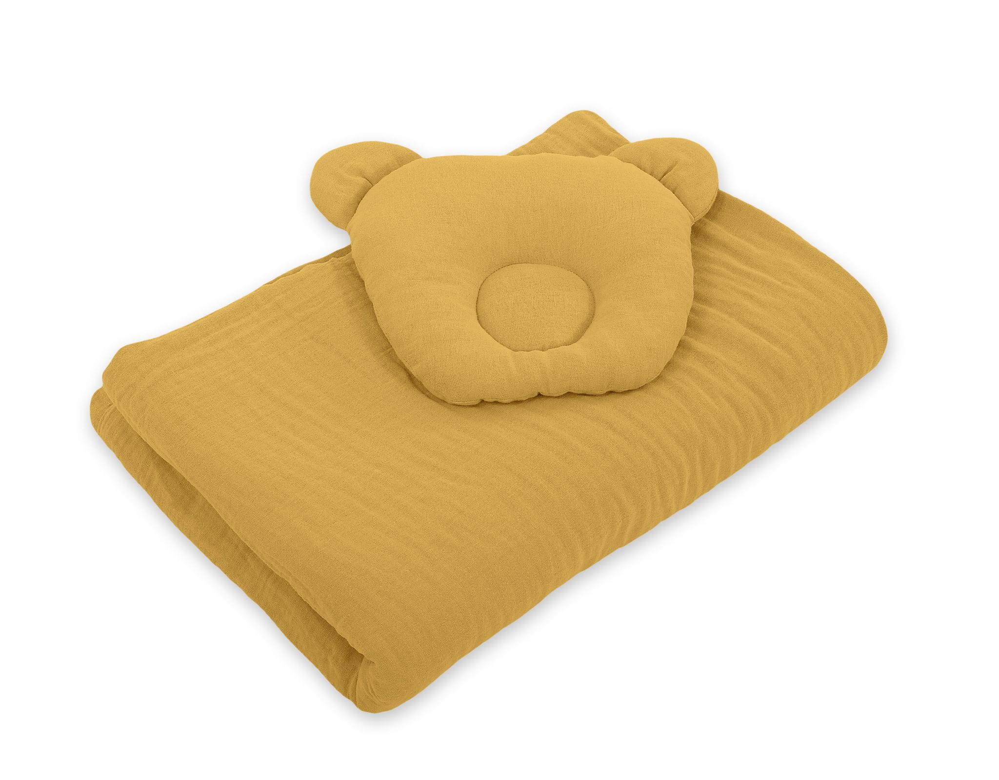 Kołderka z wypełnieniem i poduszka profilowana Miś MUŚLIN- zestaw 2cz. - musztardowy