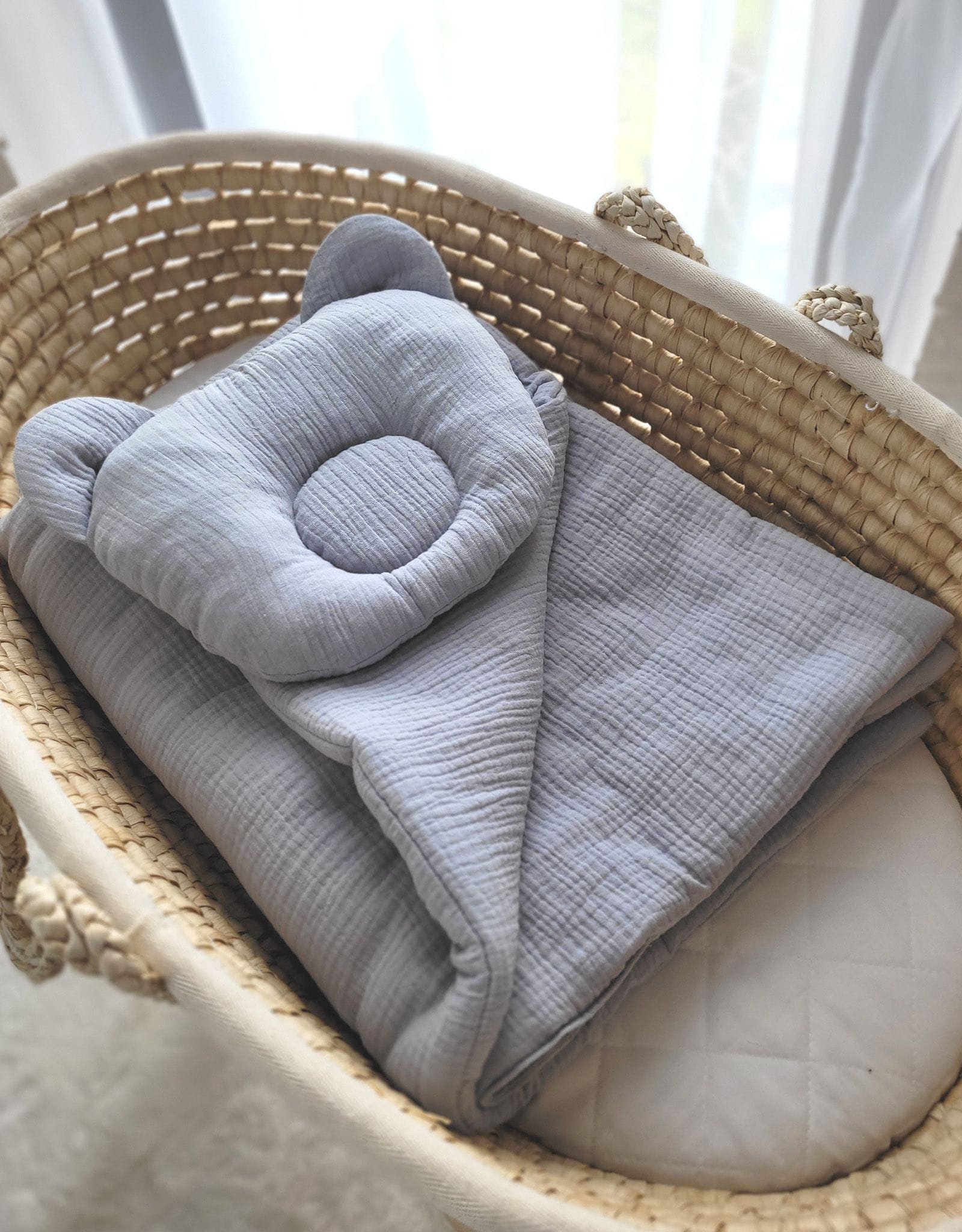 Muślinowy komplet dla niemowląt - pościel z wypełnieniem i poduszka profilowana Miś Pościel niemowlęca do gondoli wózka, kosza Mojżesza lub łóżeczka. Wykonana z bawełnianego muślinu- 100% atestowanej bawełny. Jest miła i przyjemna w dotyku. Nie podrażnia delikatnej skóry dziecka.