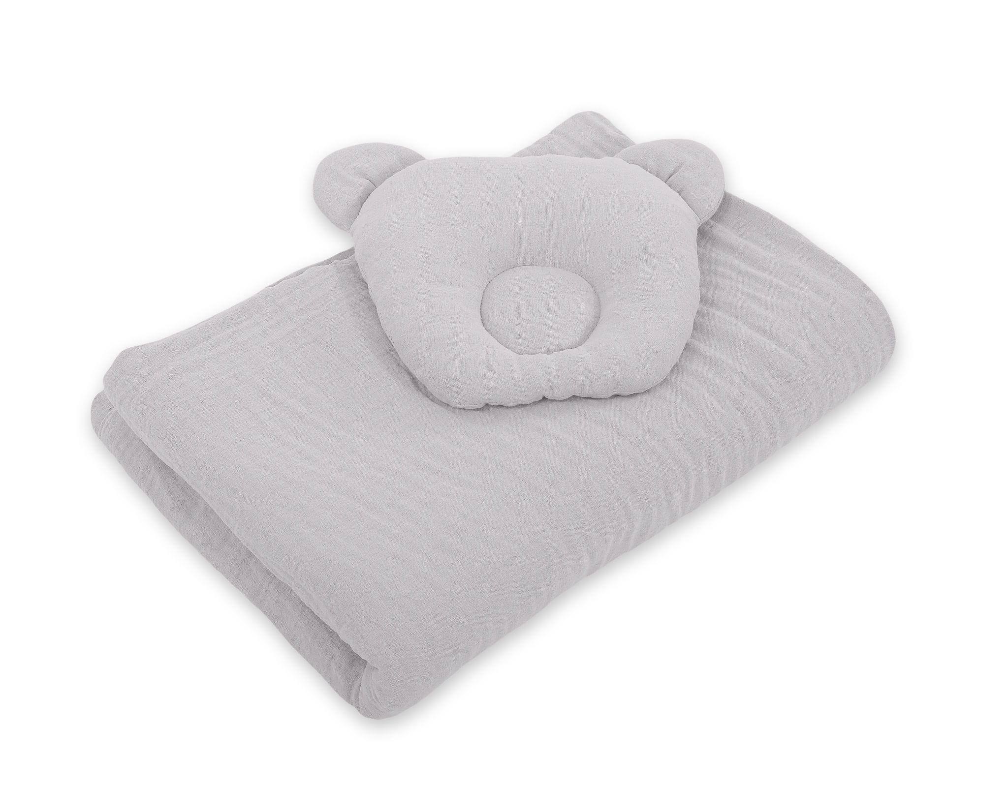Kołderka z wypełnieniem i poduszka profilowana Miś MUŚLIN- zestaw 2cz. - szara