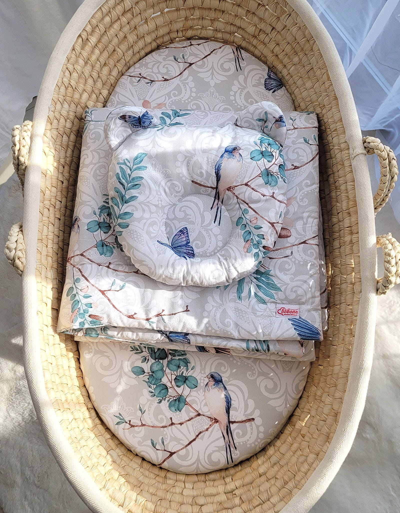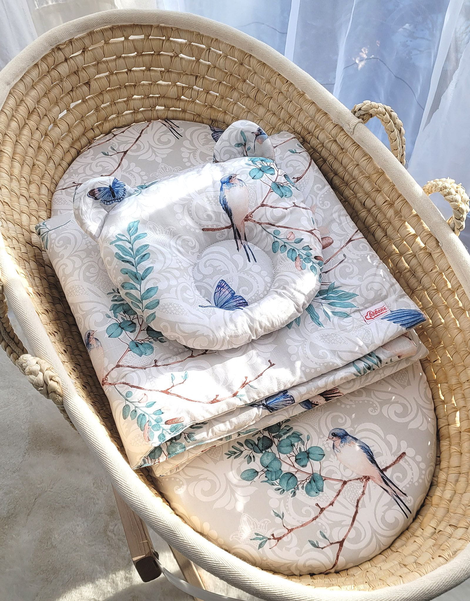 Pościel niemowlęca do gondoli wózka, kosza Mojżesza lub łóżeczka. Wykonana z trwałej 100% atestowanej bawełny. Jest miła i przyjemna w dotyku. Nie podrażnia delikatnej skóry dziecka.