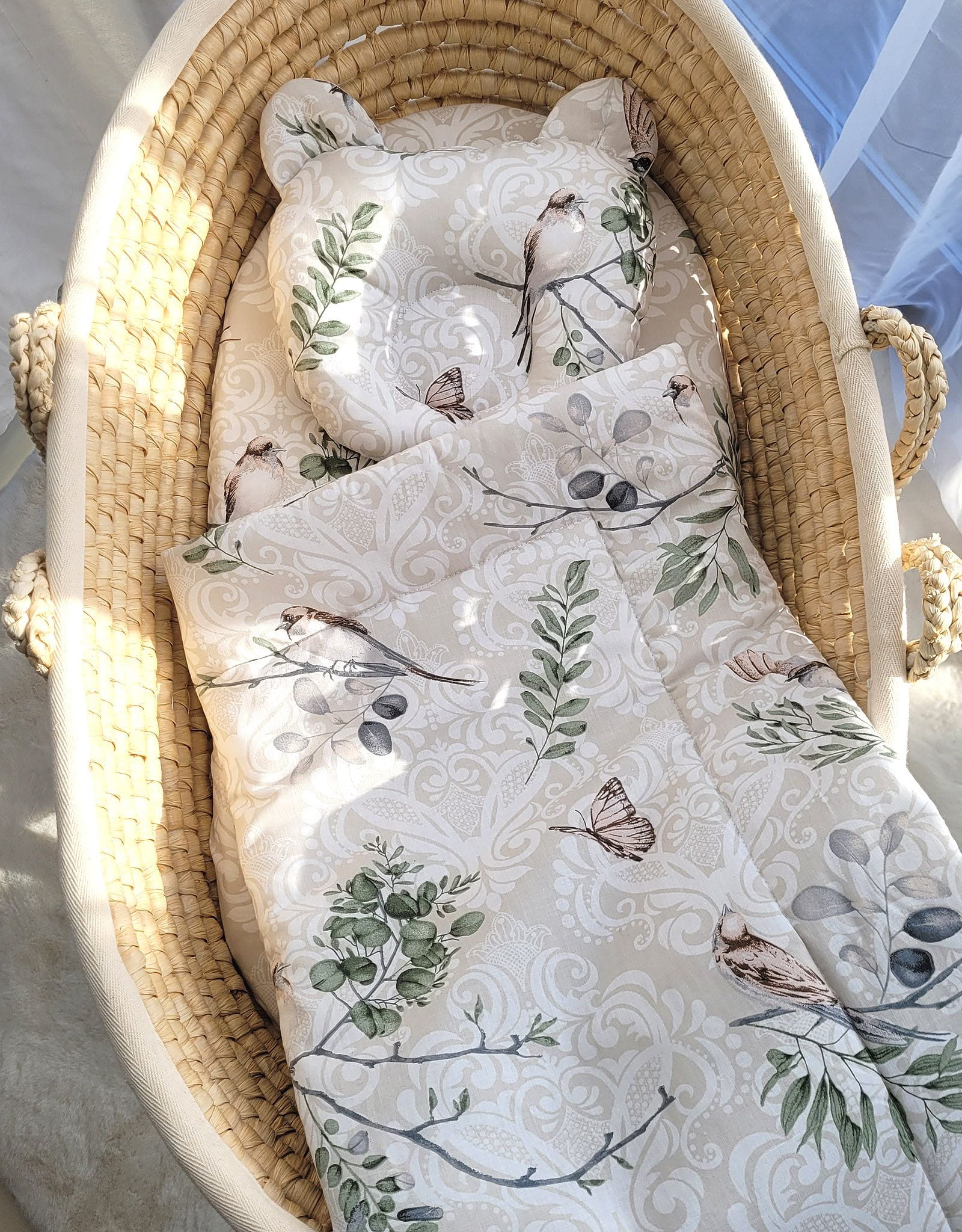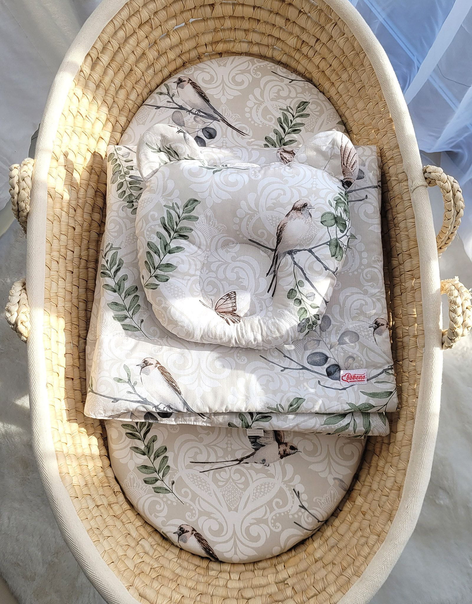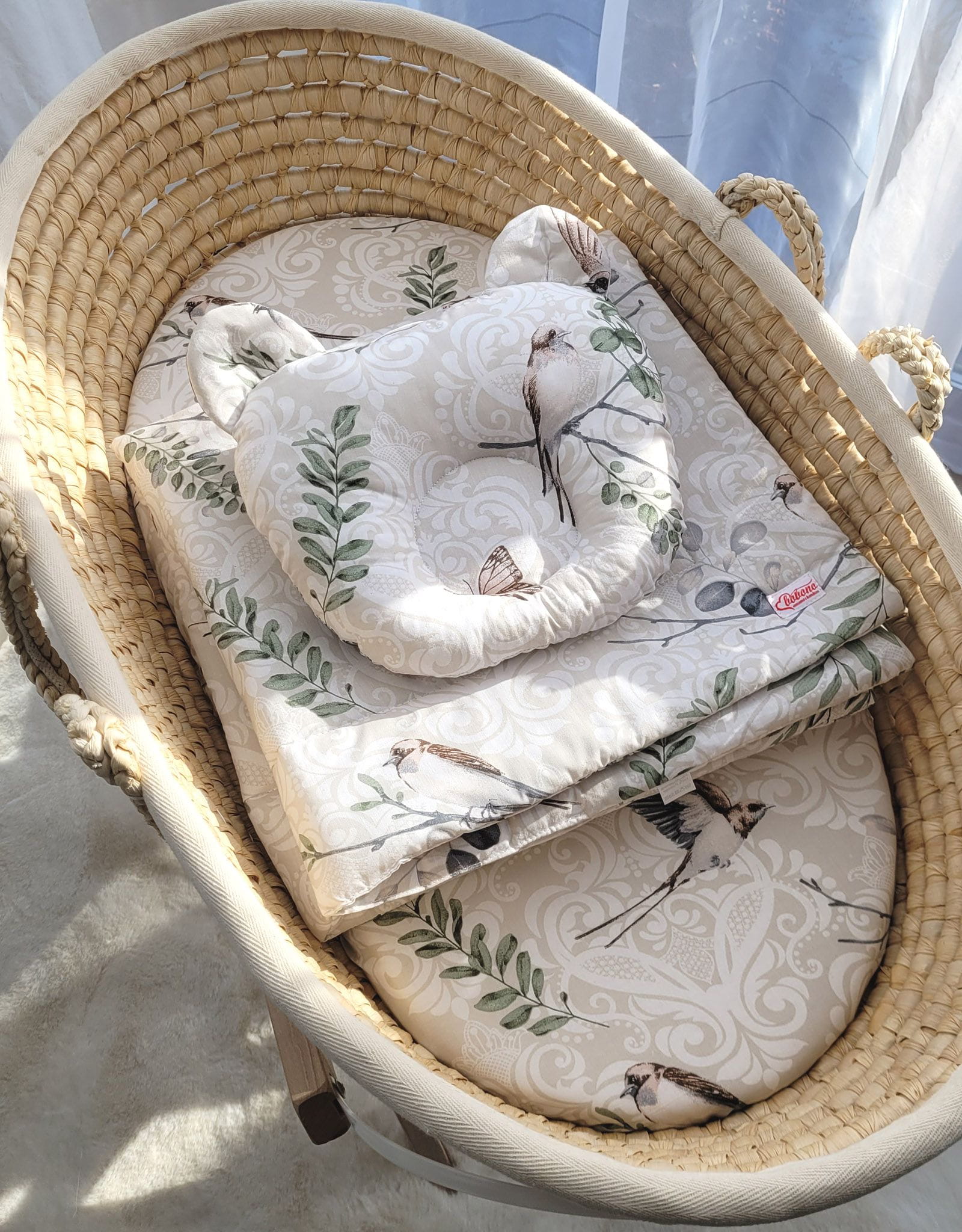 Pościel niemowlęca do gondoli wózka, kosza Mojżesza lub łóżeczka. Wykonana z trwałej 100% atestowanej bawełny. Jest miła i przyjemna w dotyku. Nie podrażnia delikatnej skóry dziecka.