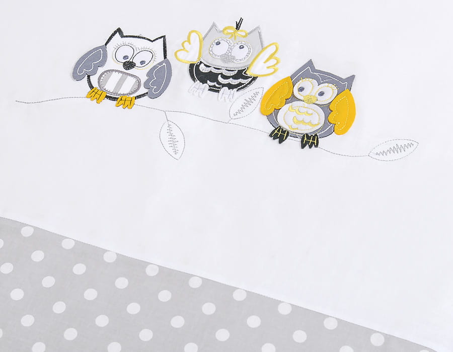 Komplet pościeli dla dzieci 120x90cm z ochraniaczem 3-cz Sówki szare z haftem szaro-żółtym