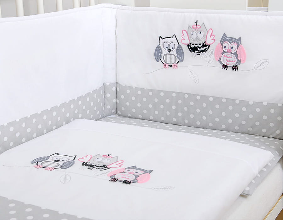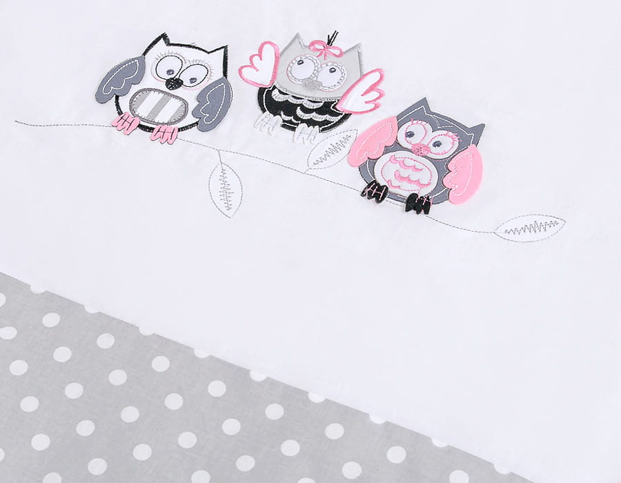 Komplet pościeli dla dzieci 135x100cm z ochraniaczem 3-cz Sówki szare z haftem szaro-różowym