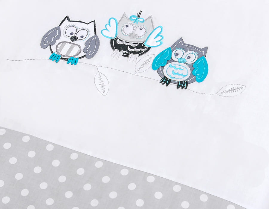 Komplet pościeli dla dzieci 135x100cm z ochraniaczem 3-cz Sówki szare z haftem szaro-turkusowym