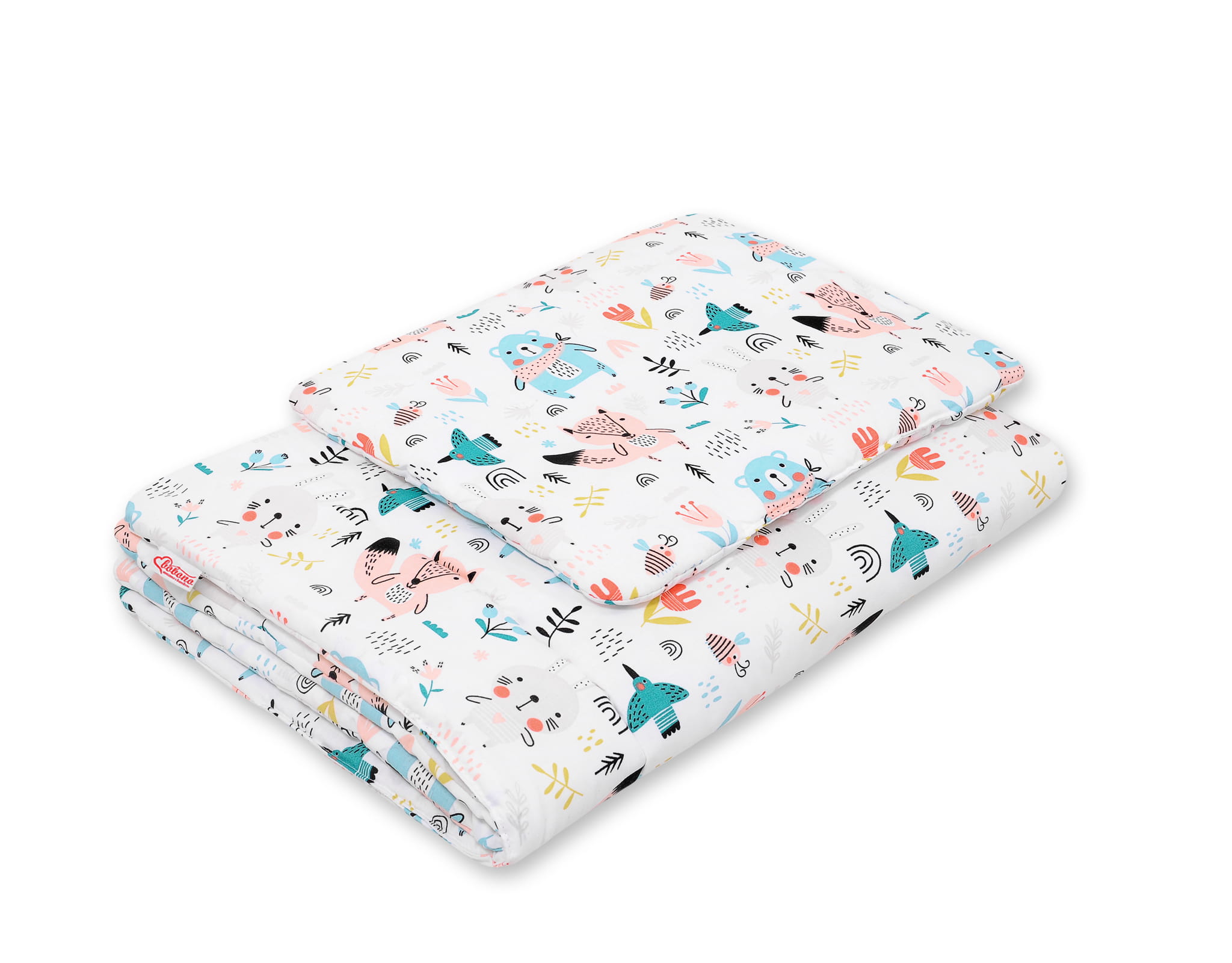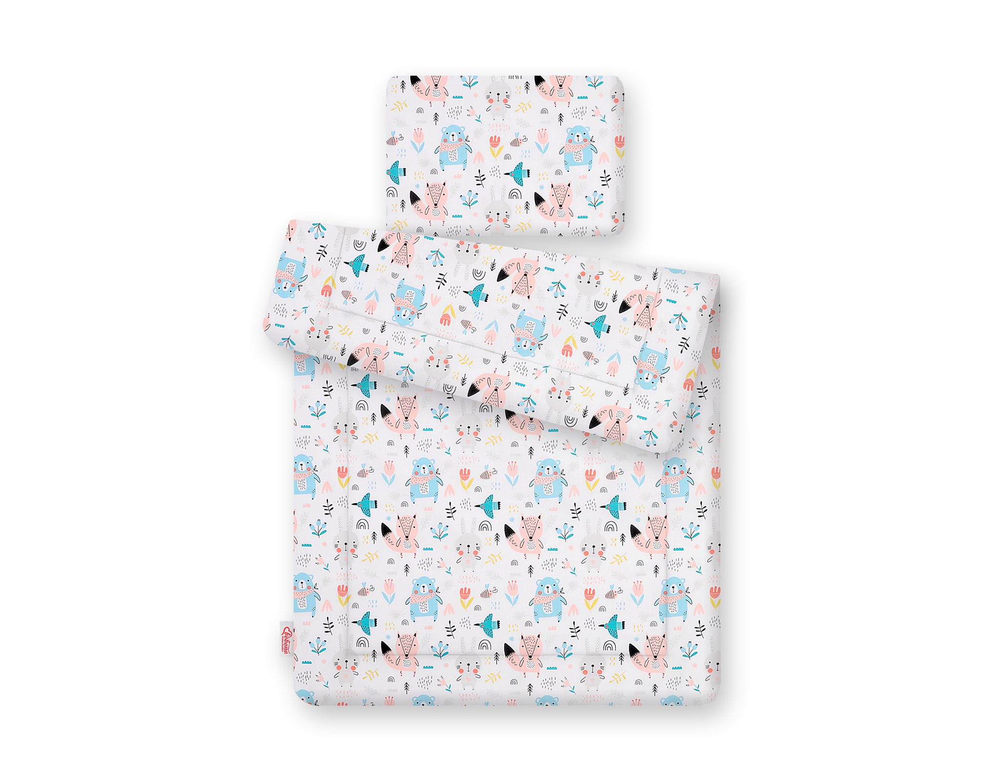 - zewnętrzna warstwa to tkanina 100% bawełniana, atestowana, miła w dotyku. Wzór znajduje się na obu stronach poduszki i kołderki;