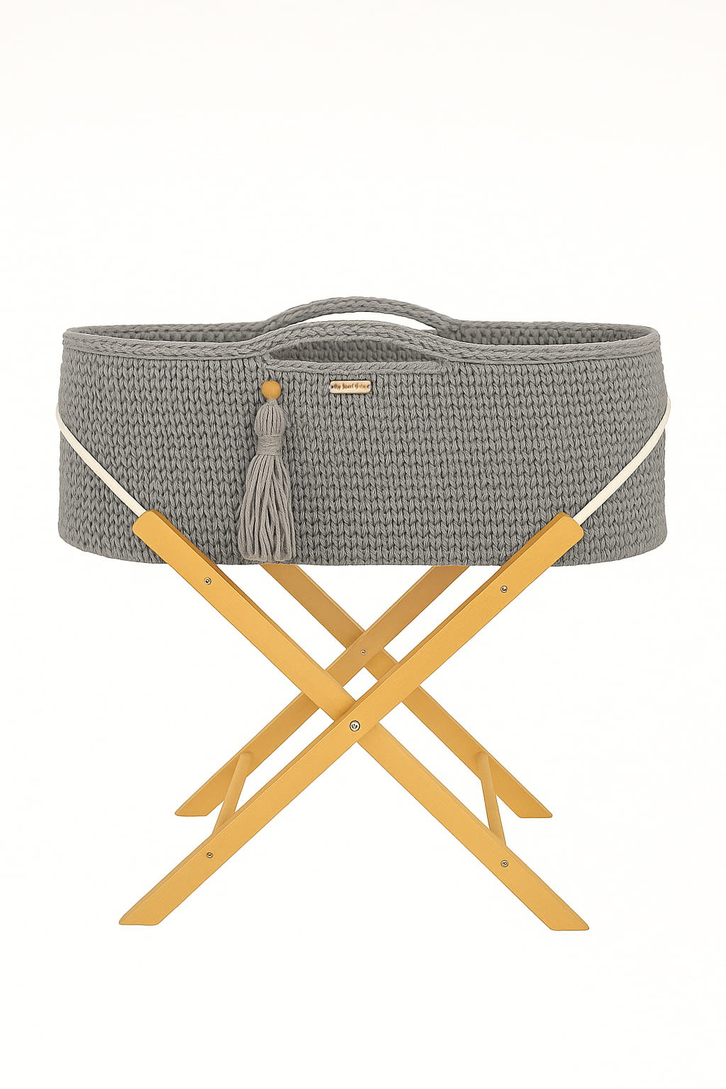 W zestawie: kosz Mojżesza z doczepionym frędzlem w stylu BOHO, materacyk Silver w pikowanym pokrowcu, drewniany stojak do kosza.