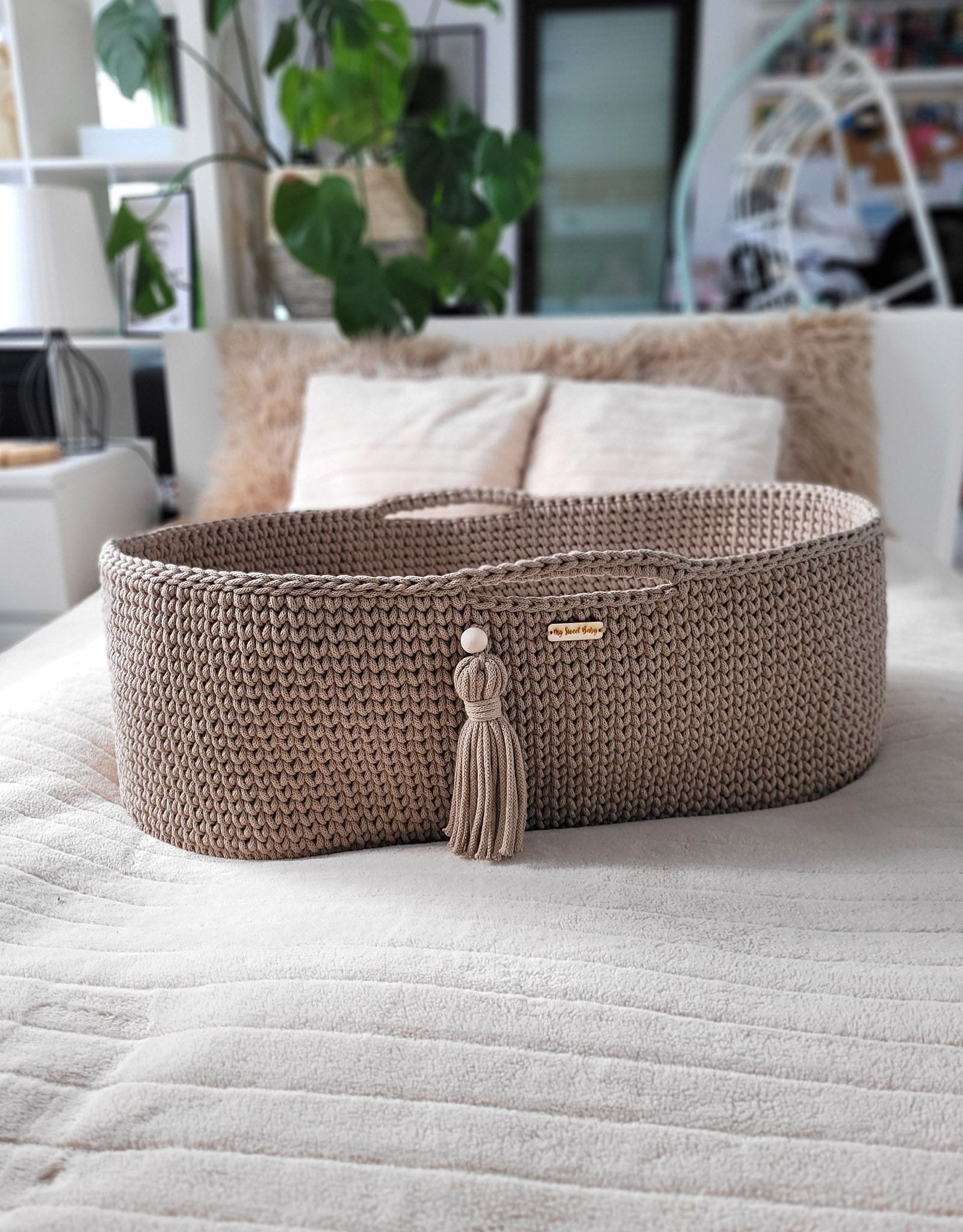 Kosz wykonany jest ręcznie ze sznurka bawełnianego. Miękkie wygodne pierwsze łóżeczko dla noworodka. Dzięki niewielkim wymiarom kosz Mojżesza może towarzyszyć rodzicom w każdym pokoju. Bawełniany sznurek z którego wypleciony jest kosz jest miękki, delikatny, a równocześnie bardzo stabilny. Ścieg szydełkowy wykorzystany w koszu jest lekko ażurowy, dzięki czemu zapewniona jest odpowiednia cyrkulacja powietrza. Dzięki uchwytom kosz Mojżesza można w łatwy sposób przenosić i mieć malucha zawsze blisko siebie.