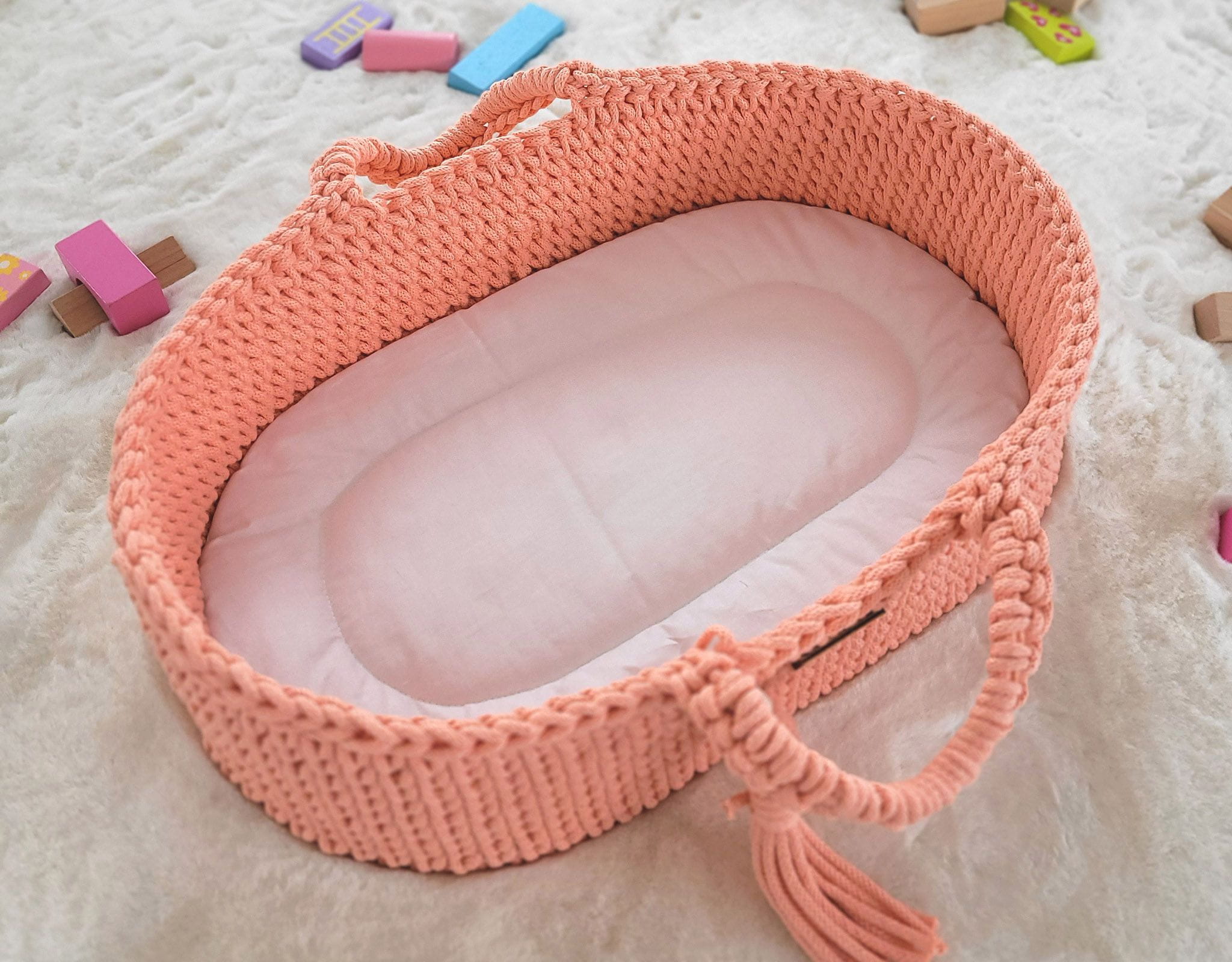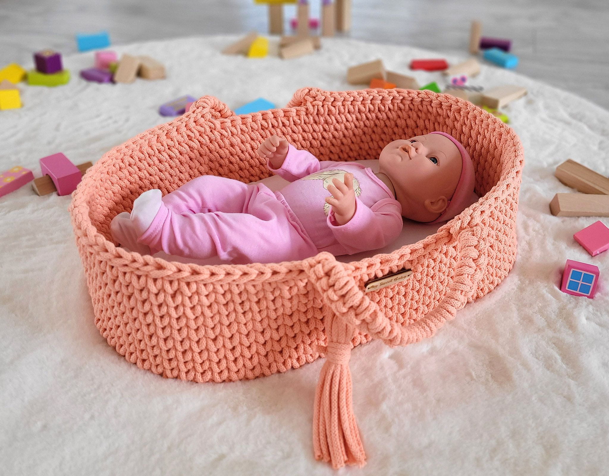Kosz Mojżesza BOHO dla lalek – handmade, 100% bawełna