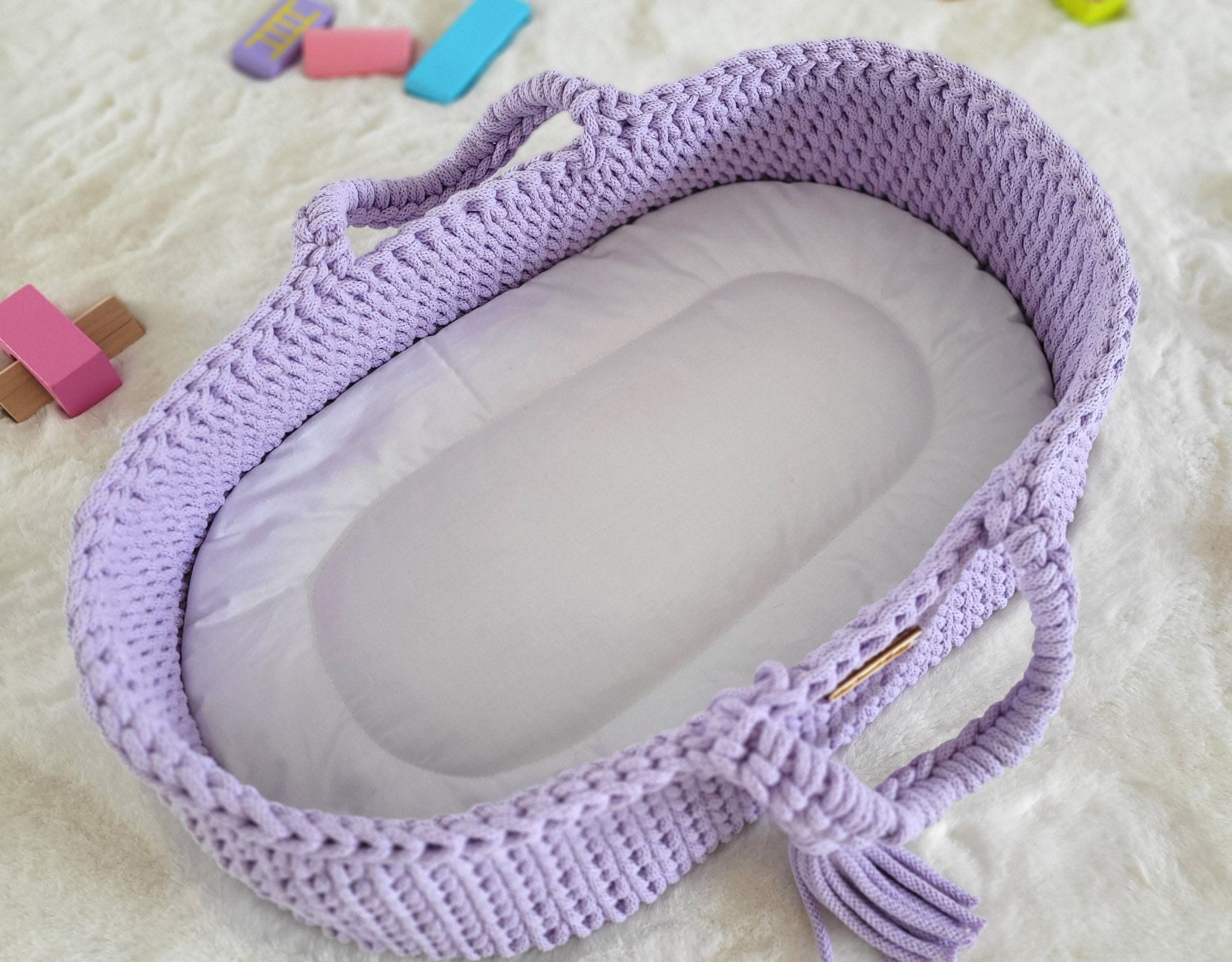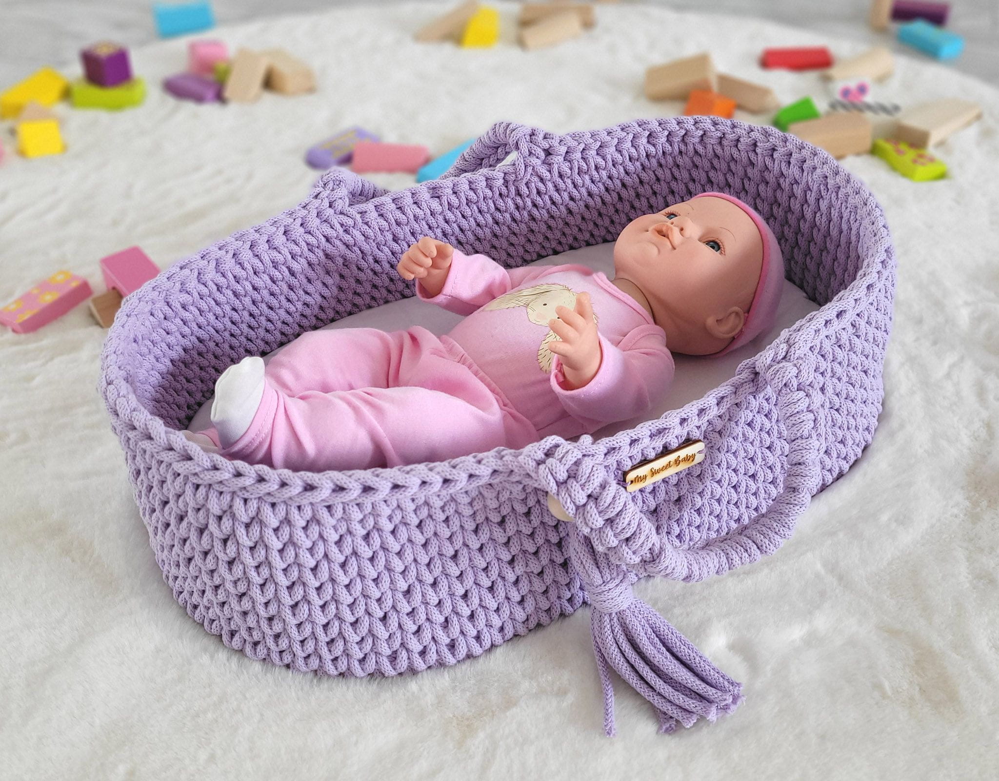 Kosz Mojżesza BOHO dla lalek – handmade, 100% bawełna