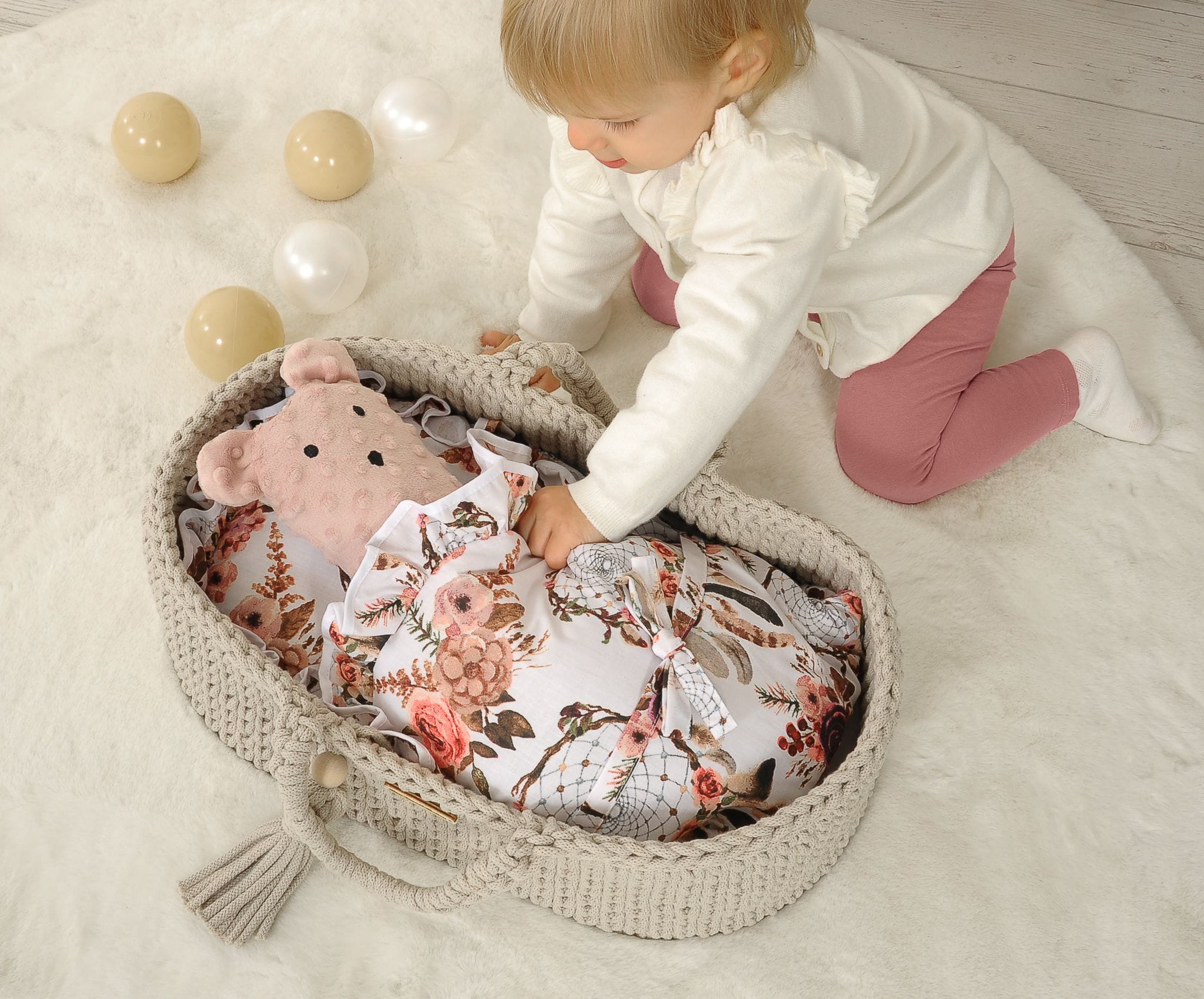 Kosz Mojżesza BOHO dla lalek – handmade, 100% bawełna