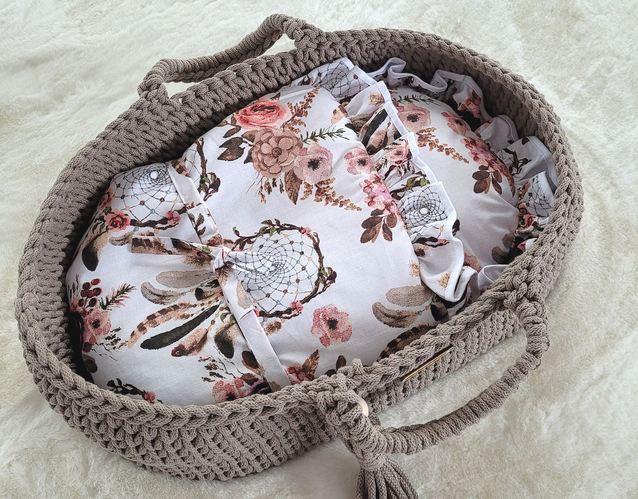 Kosz Mojżesza BOHO dla lalek – handmade, 100% bawełna