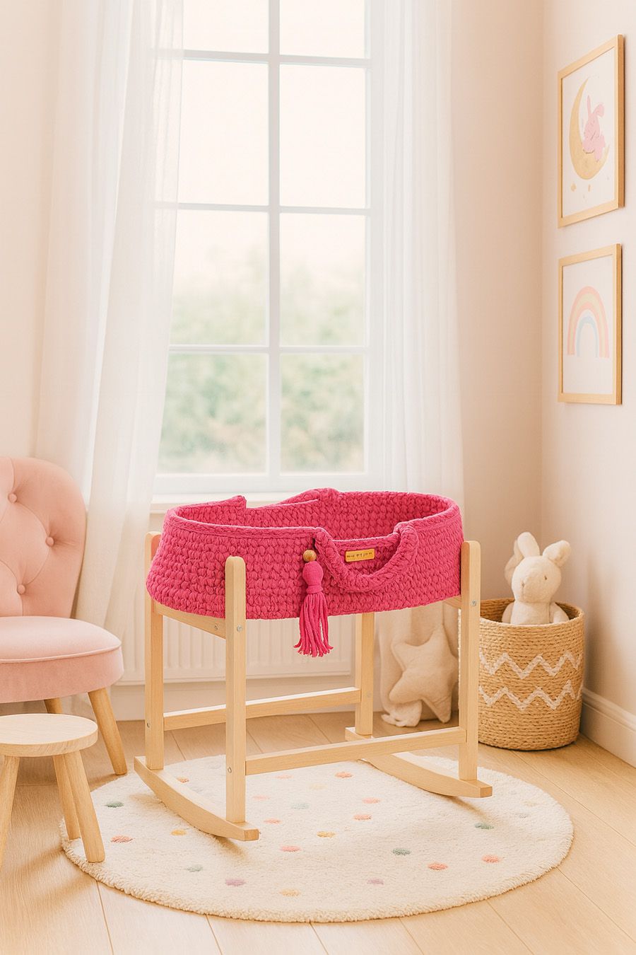 Piękny Kosz Mojżesza w stylu BOHO dla lalek to wyjątkowa miniaturka popularnego kosza niemowlęcego — wykonana ręcznie w Polsce z najwyższej jakości bawełnianego sznurka. To idealny dodatek do zabawy w dom, który zachwyci każdą małą opiekunkę lalek.