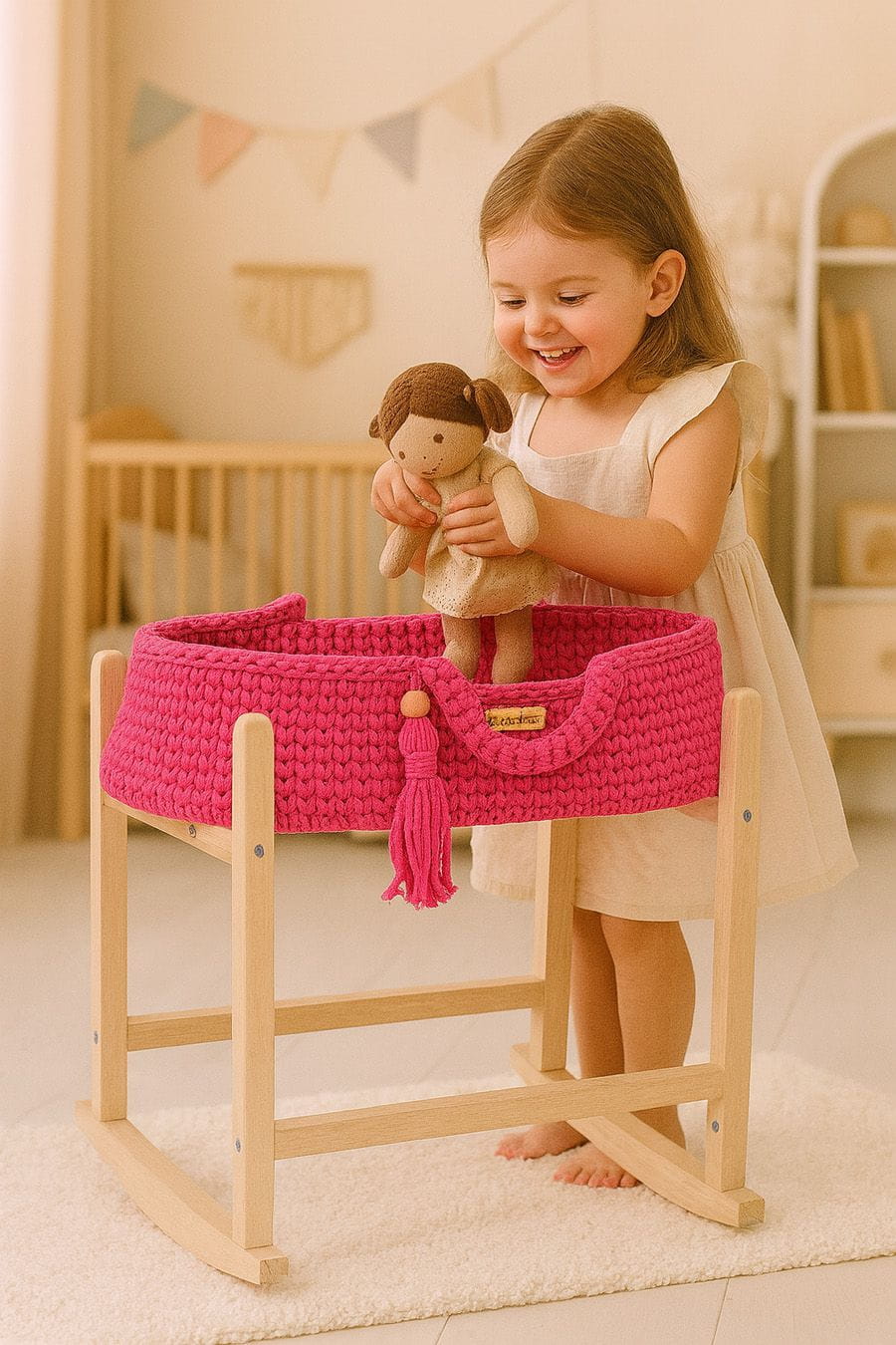 - Drewniany stojak–kołyska w zestawie – stabilny i pięknie wykonany, pozwala delikatnie bujać kosz, zapewniając jeszcze więcej radości i realistycznej zabawy!