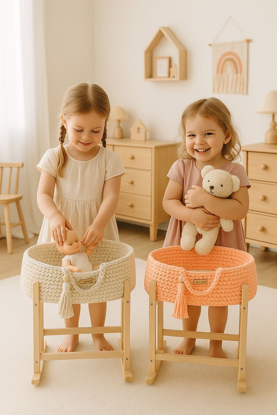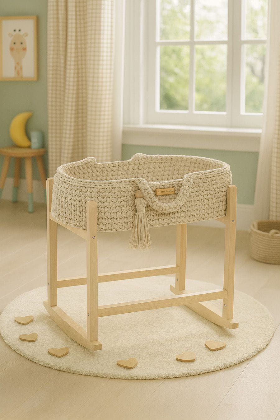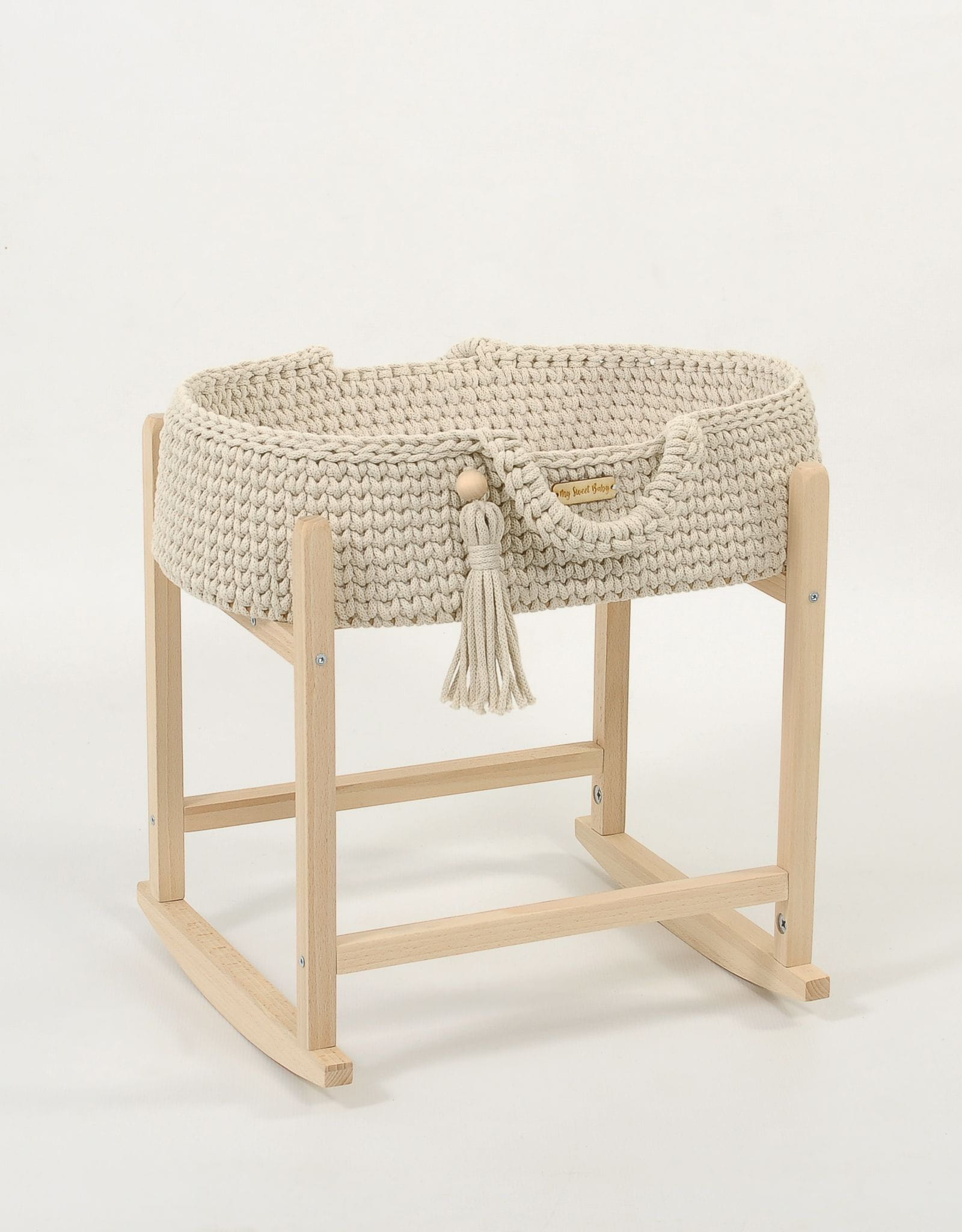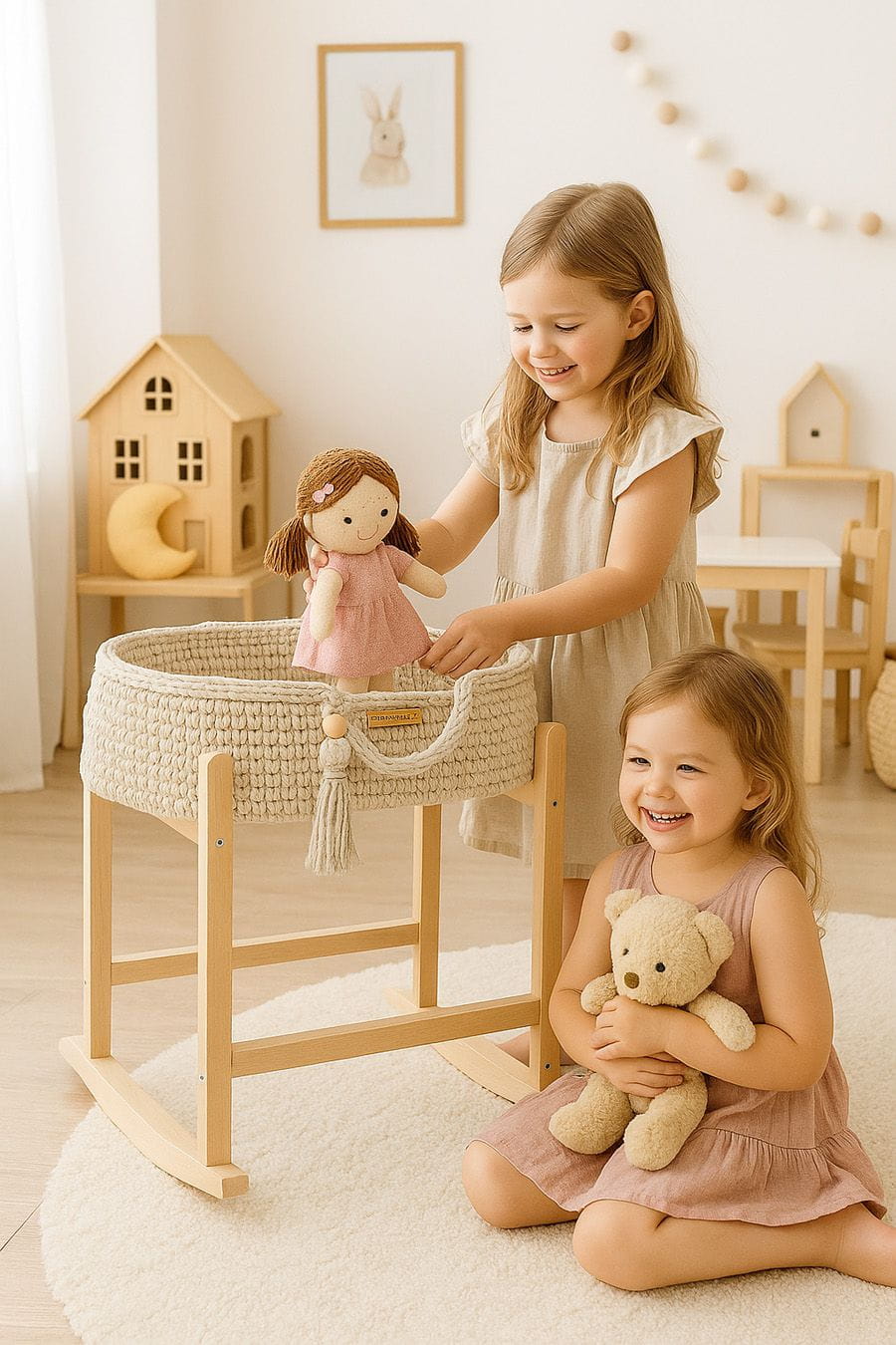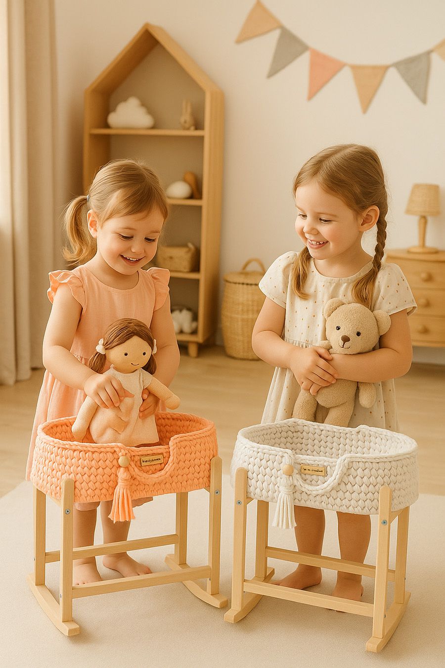 - Drewniany stojak–kołyska w zestawie – stabilny i pięknie wykonany, pozwala delikatnie bujać kosz, zapewniając jeszcze więcej radości i realistycznej zabawy!
