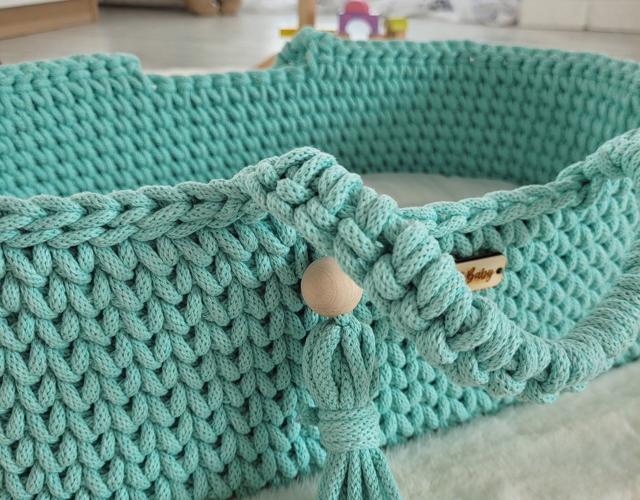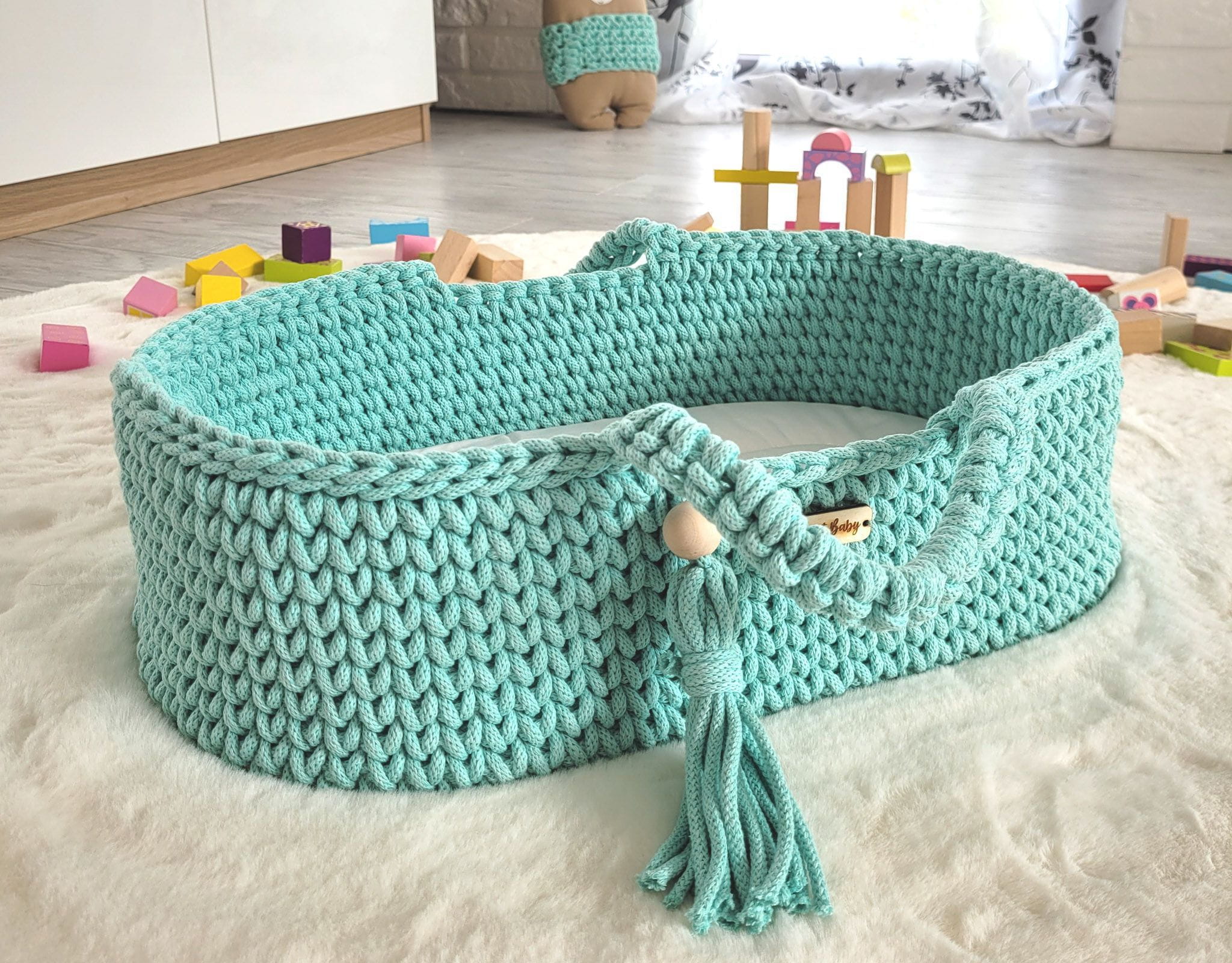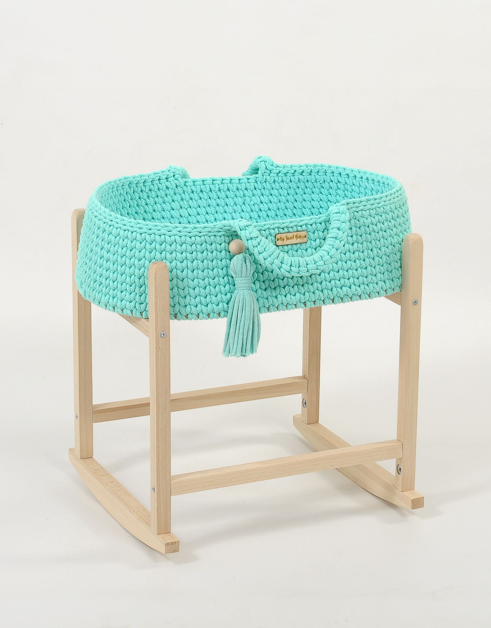 Kosz Mojżesza BOHO bawełniany nosidełko dla lalek z drewnianą kołyską - miętowy