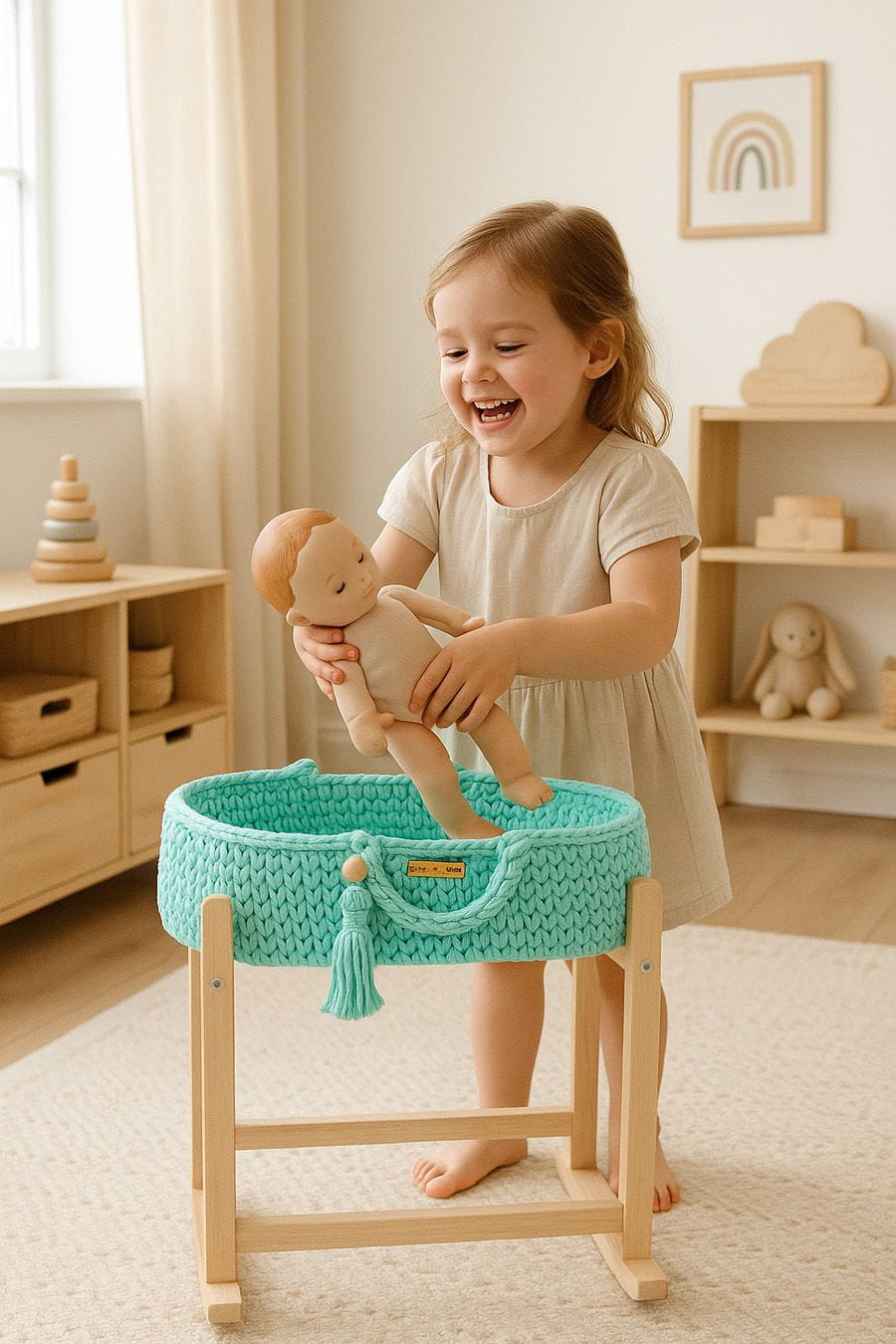 - Drewniany stojak–kołyska w zestawie – stabilny i pięknie wykonany, pozwala delikatnie bujać kosz, zapewniając jeszcze więcej radości i realistycznej zabawy!