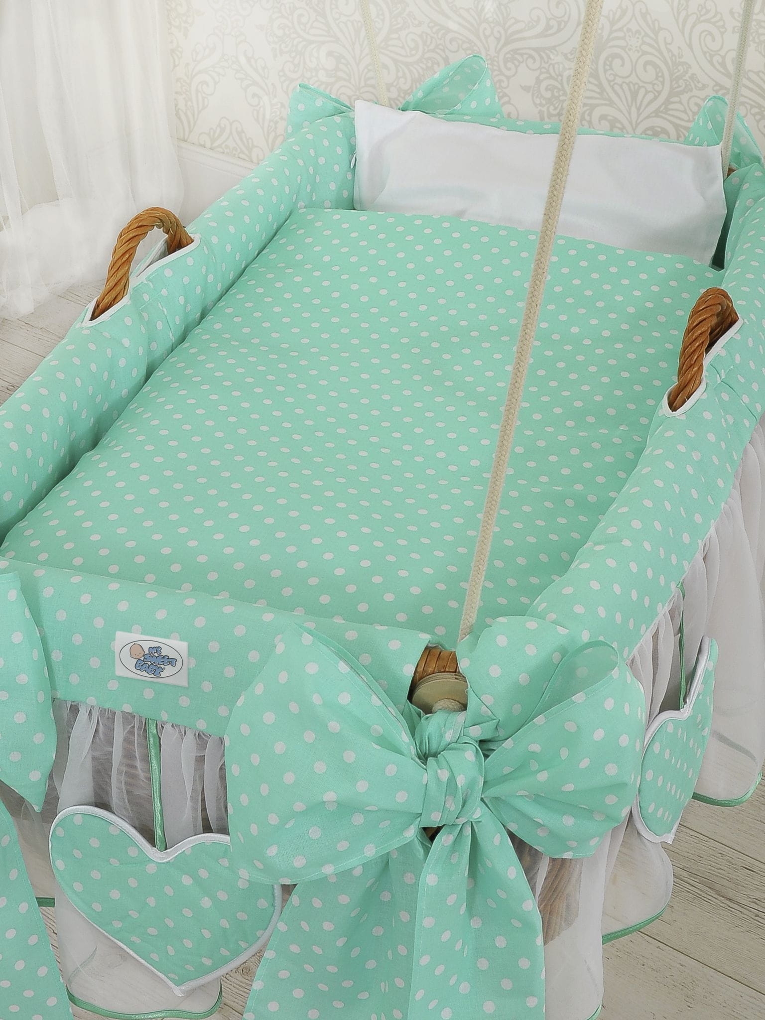 Wiklinowy kosz niemowlęcy kołyska do zawieszenia. Pięknie, ręcznie wypleciony kosz z polskiej wikliny, z charakterystycznym "holenderskim" splotem. Kołyska zawieszona na długich linach pozwala na delikatne miękkie kołysanie dziecka, doskonałe do wyciszenia i uspokojenia, zapewnia zdrowy sen. Obszycie 100% bawełna. Na brzegach kosza dwie rączki ułatwiające kołysani lub przenoszenie kosza. Obszycie na kosz z 100% bawełny, trzywarstwowe, z dodatkową warstwą miękkiej oddychającej włókniny dla wytłumienia kosza i zapewnienia spokoju i ciszy dziecku. Falbanka z białego tiulu, ozdobiona wiszącymi serduszkami.W skład kompletu wchodzą: