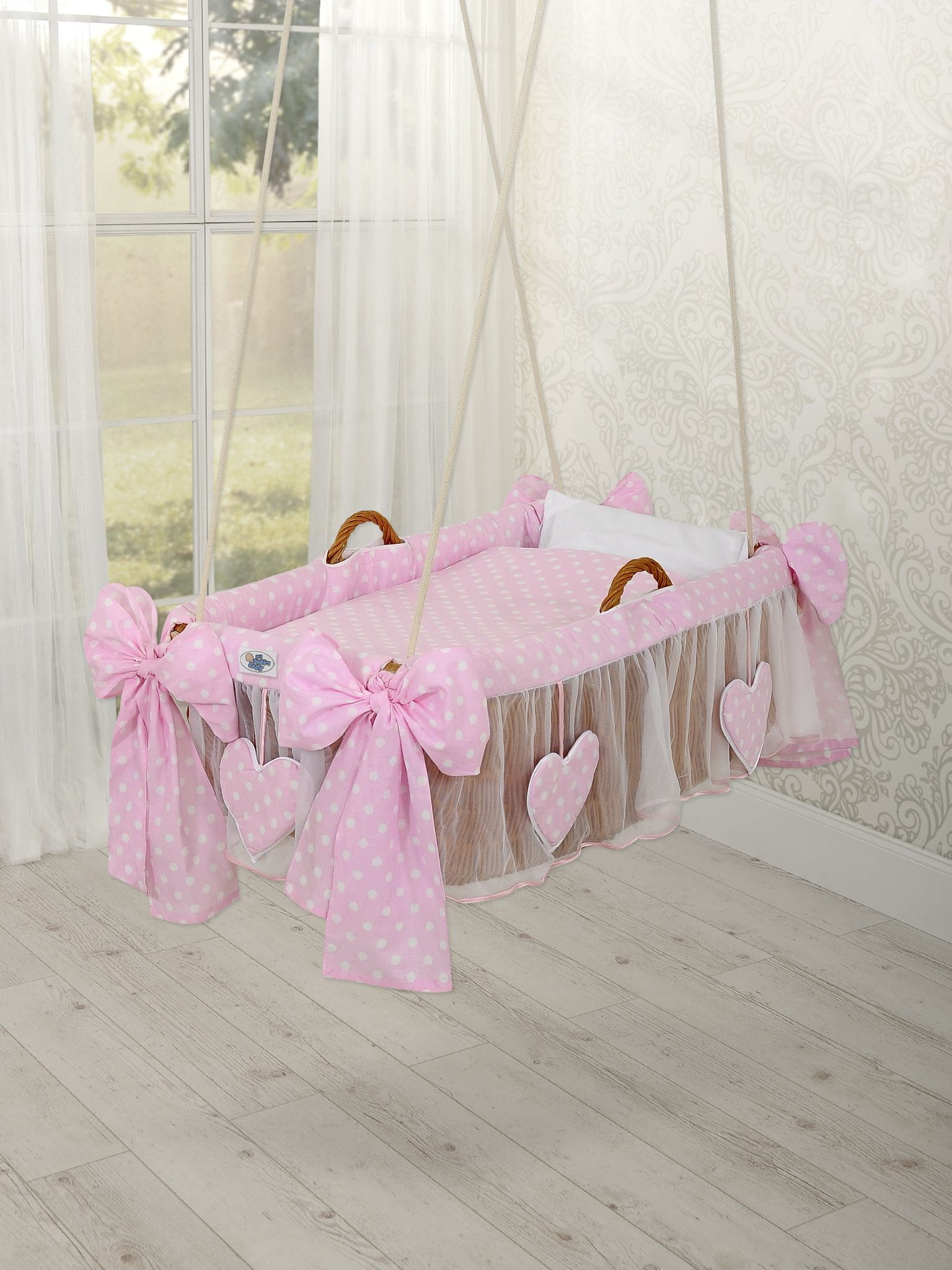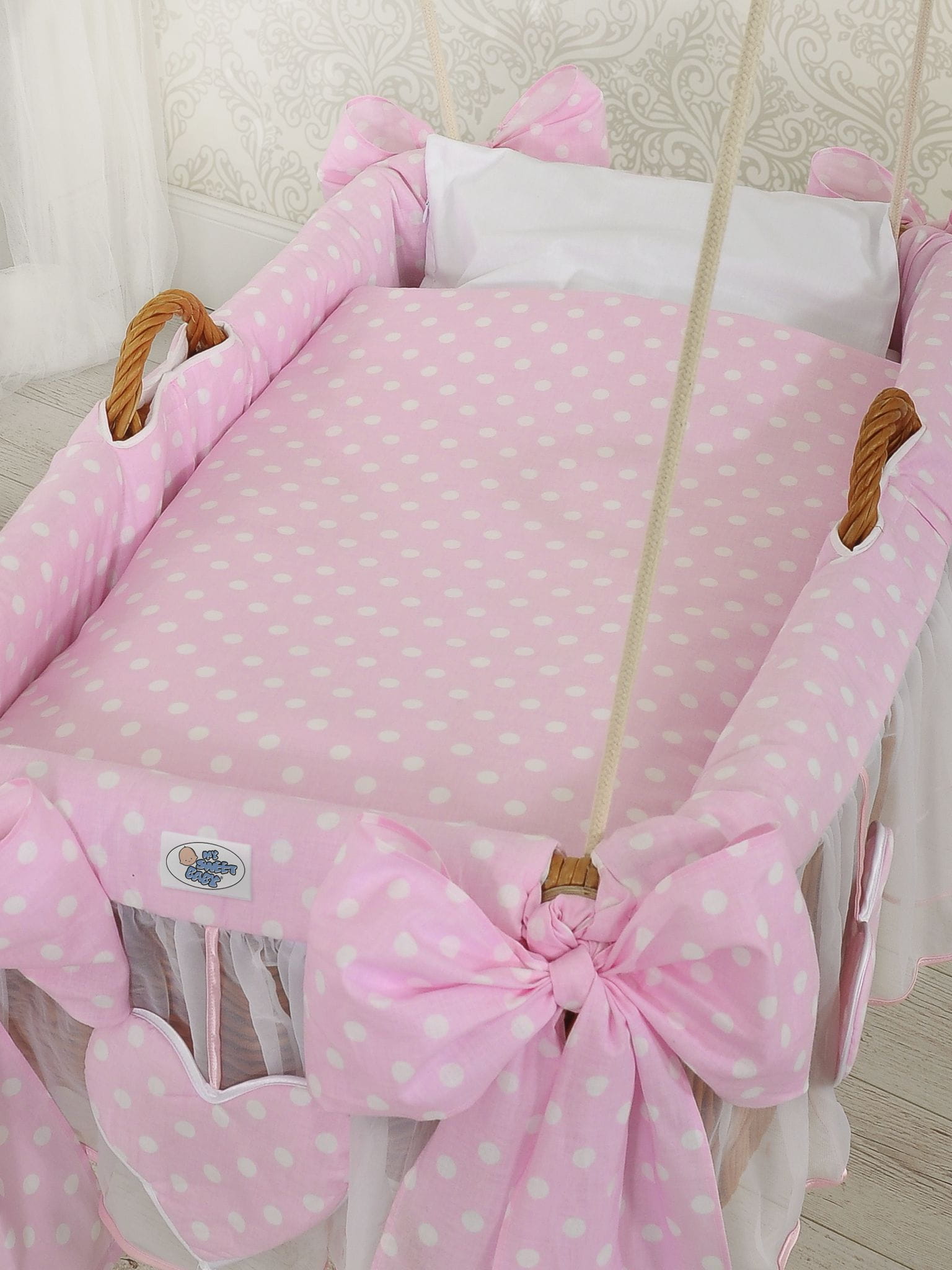 Wiklinowy kosz niemowlęcy kołyska do zawieszenia. Pięknie, ręcznie wypleciony kosz z polskiej wikliny, z charakterystycznym "holenderskim" splotem. Kołyska zawieszona na długich linach pozwala na delikatne miękkie kołysanie dziecka, doskonałe do wyciszenia i uspokojenia, zapewnia zdrowy sen. Obszycie 100% bawełna. Na brzegach kosza dwie rączki ułatwiające kołysani lub przenoszenie kosza. Obszycie na kosz z 100% bawełny, trzywarstwowe, z dodatkową warstwą miękkiej oddychającej włókniny dla wytłumienia kosza i zapewnienia spokoju i ciszy dziecku. Falbanka z białego tiulu, ozdobiona wiszącymi serduszkami.W skład kompletu wchodzą: