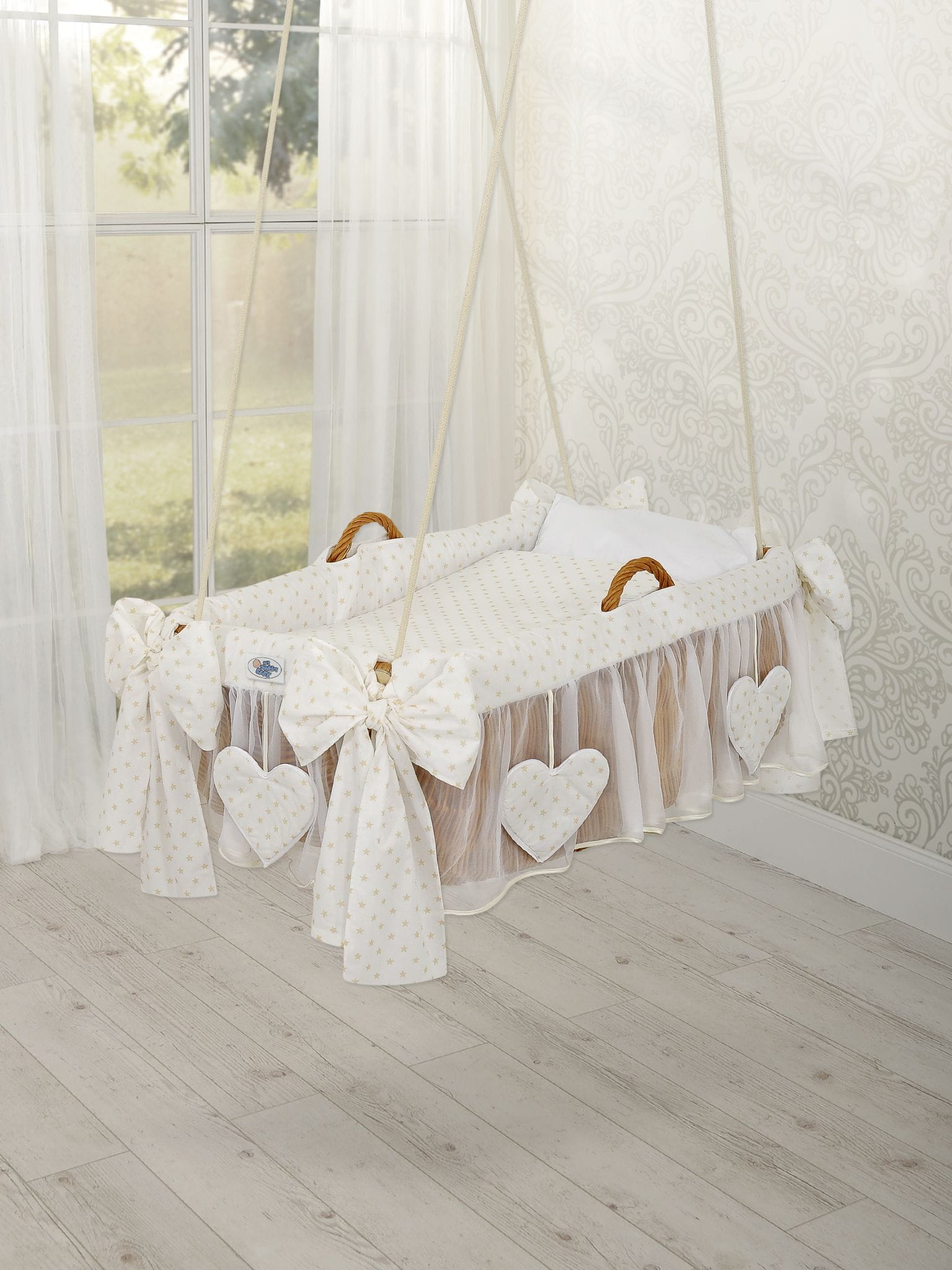 Wiklinowy kosz niemowlęcy kołyska do zawieszenia. Pięknie, ręcznie wypleciony kosz z polskiej wikliny, z charakterystycznym "holenderskim" splotem. Kołyska zawieszona na długich linach pozwala na delikatne miękkie kołysanie dziecka, doskonałe do wyciszenia i uspokojenia, zapewnia zdrowy sen. Obszycie 100% bawełna. Na brzegach kosza dwie rączki ułatwiające kołysani lub przenoszenie kosza. Obszycie na kosz z 100% bawełny, trzywarstwowe, z dodatkową warstwą miękkiej oddychającej włókniny dla wytłumienia kosza i zapewnienia spokoju i ciszy dziecku. Falbanka z białego tiulu, ozdobiona wiszącymi serduszkami.W skład kompletu wchodzą: