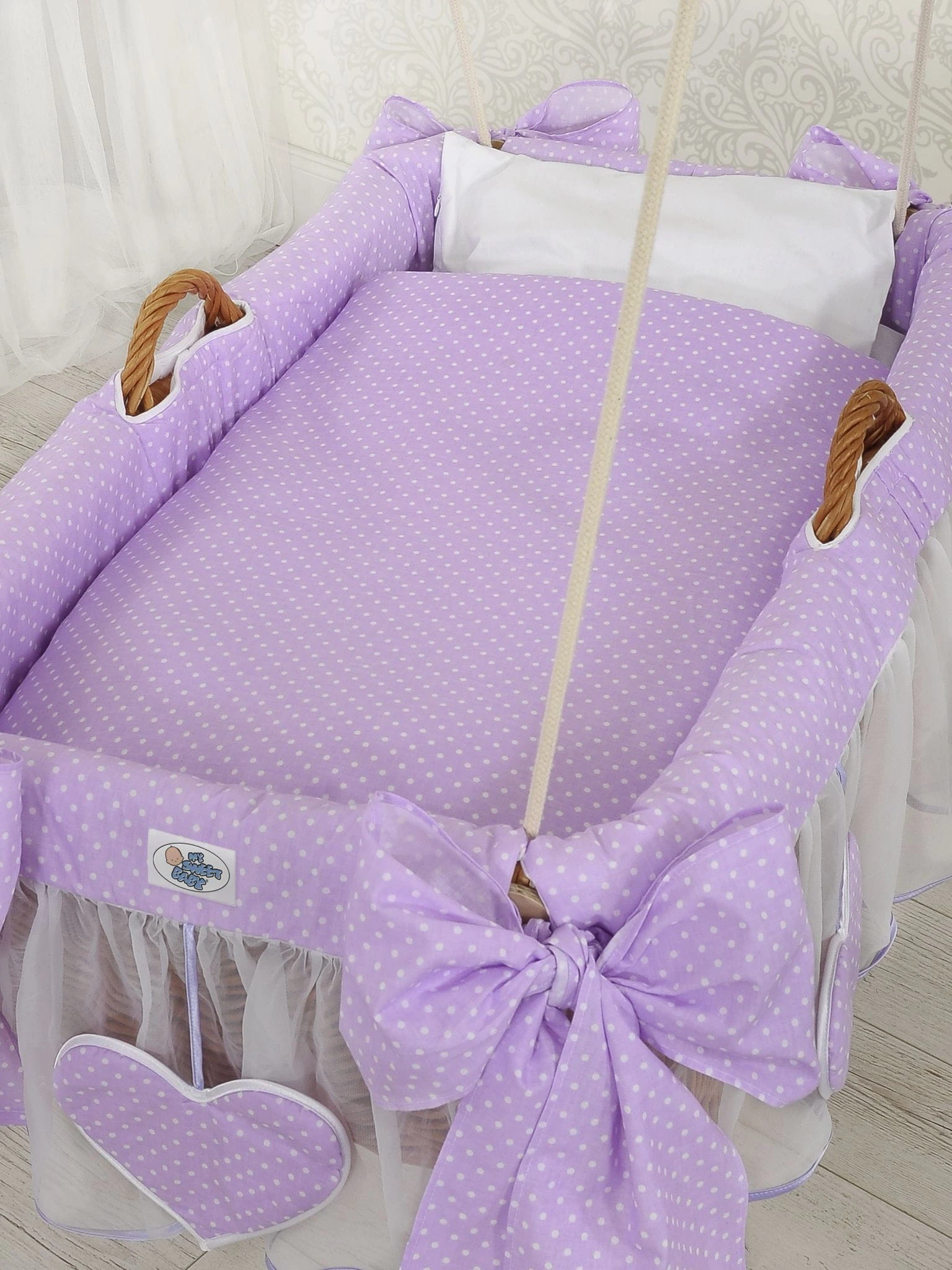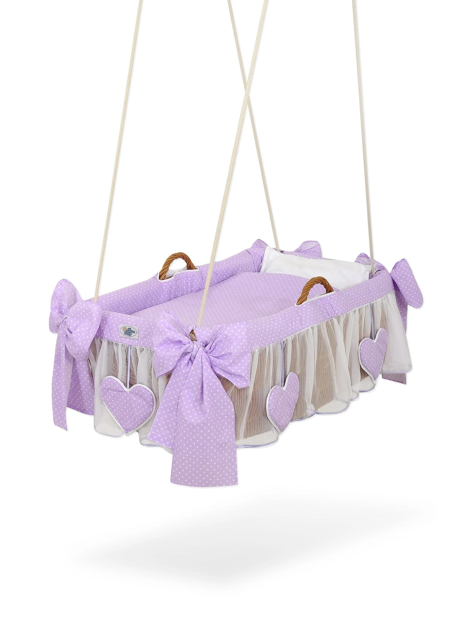 Wiklinowy kosz niemowlęcy kołyska do zawieszenia. Pięknie, ręcznie wypleciony kosz z polskiej wikliny, z charakterystycznym "holenderskim" splotem. Kołyska zawieszona na długich linach pozwala na delikatne miękkie kołysanie dziecka, doskonałe do wyciszenia i uspokojenia, zapewnia zdrowy sen. Obszycie 100% bawełna. Na brzegach kosza dwie rączki ułatwiające kołysani lub przenoszenie kosza. Obszycie na kosz z 100% bawełny, trzywarstwowe, z dodatkową warstwą miękkiej oddychającej włókniny dla wytłumienia kosza i zapewnienia spokoju i ciszy dziecku. Falbanka z białego tiulu, ozdobiona wiszącymi serduszkami.W skład kompletu wchodzą: