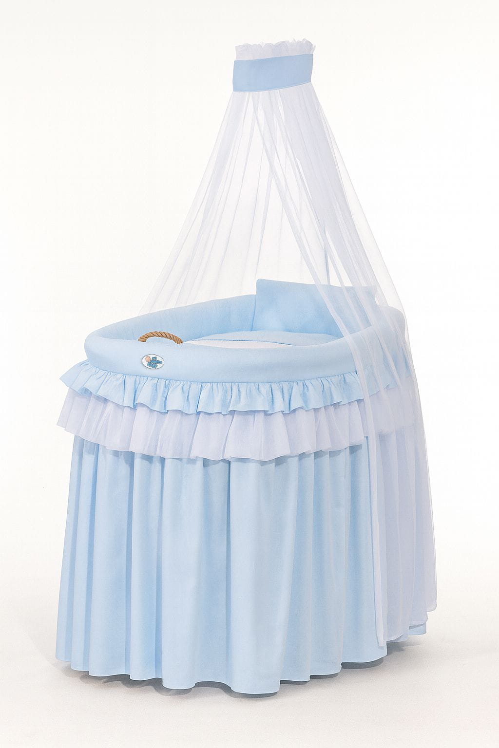 Piękny, duży ręcznie pleciony wiklinowy kosz z oryginalnym drewnianym podwoziem umożliwiającym łatwe przestawianie kosza. Naturalny kolor wikliny i drewna. Obszycie kosza uszyte z najwyższej jakości tkaniny bawełnianej posiadającej certyfikat Oekotex. Baldachim z białego lekkiego tiulu. Każdy element jest rozbieralny do prania.