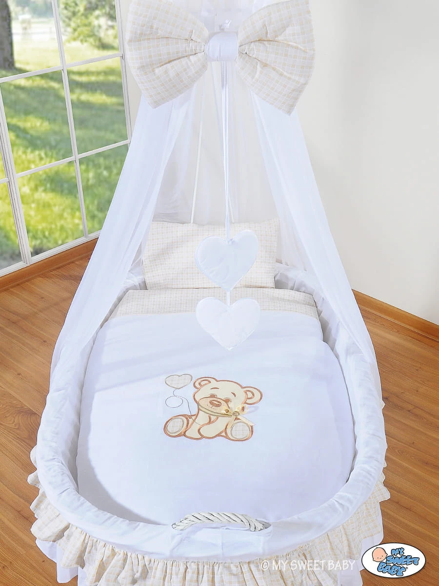 Kosz Mojżesza z baldachimem- Miś z kokardką biały