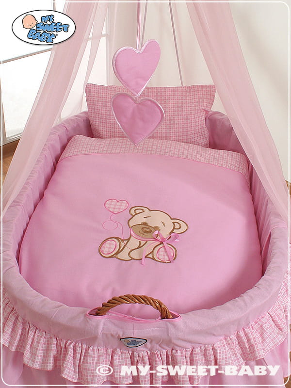 Kosz Mojżesza z baldachimem- Miś z kokardką różowy