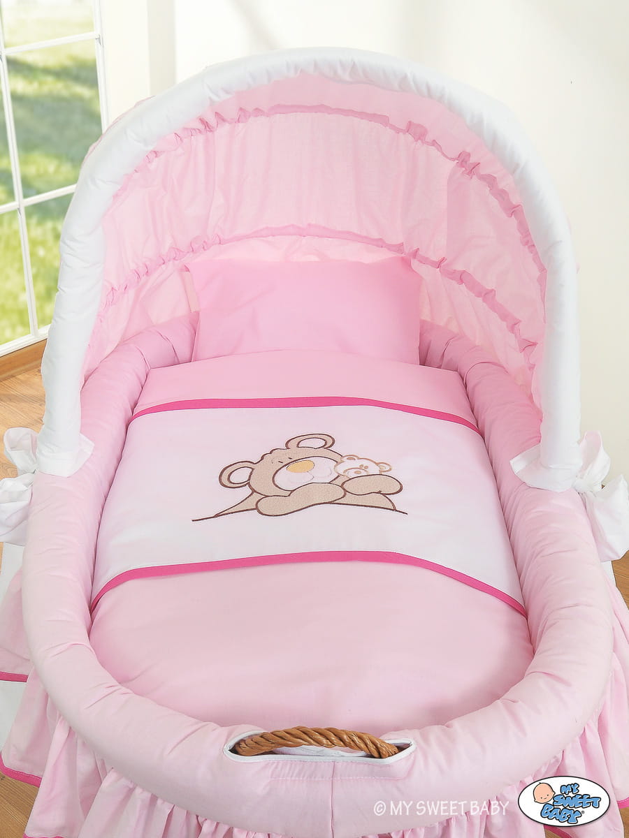 Kosz Mojżesza z budą- Miś Barnaba naturalny + różowo-biała pościel z haftem