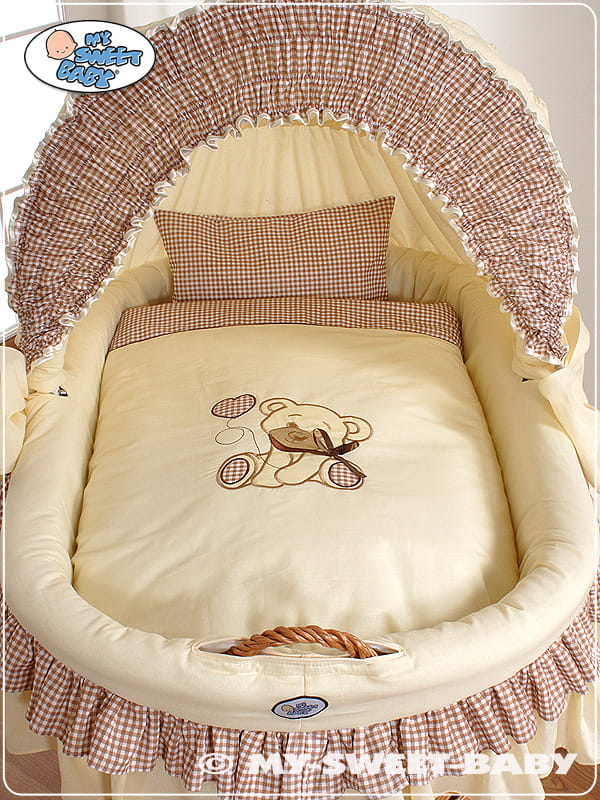 Kosz Mojżesza z budą- Miś z kokardką naturalny + kremowo-brązowo pościel z haftem