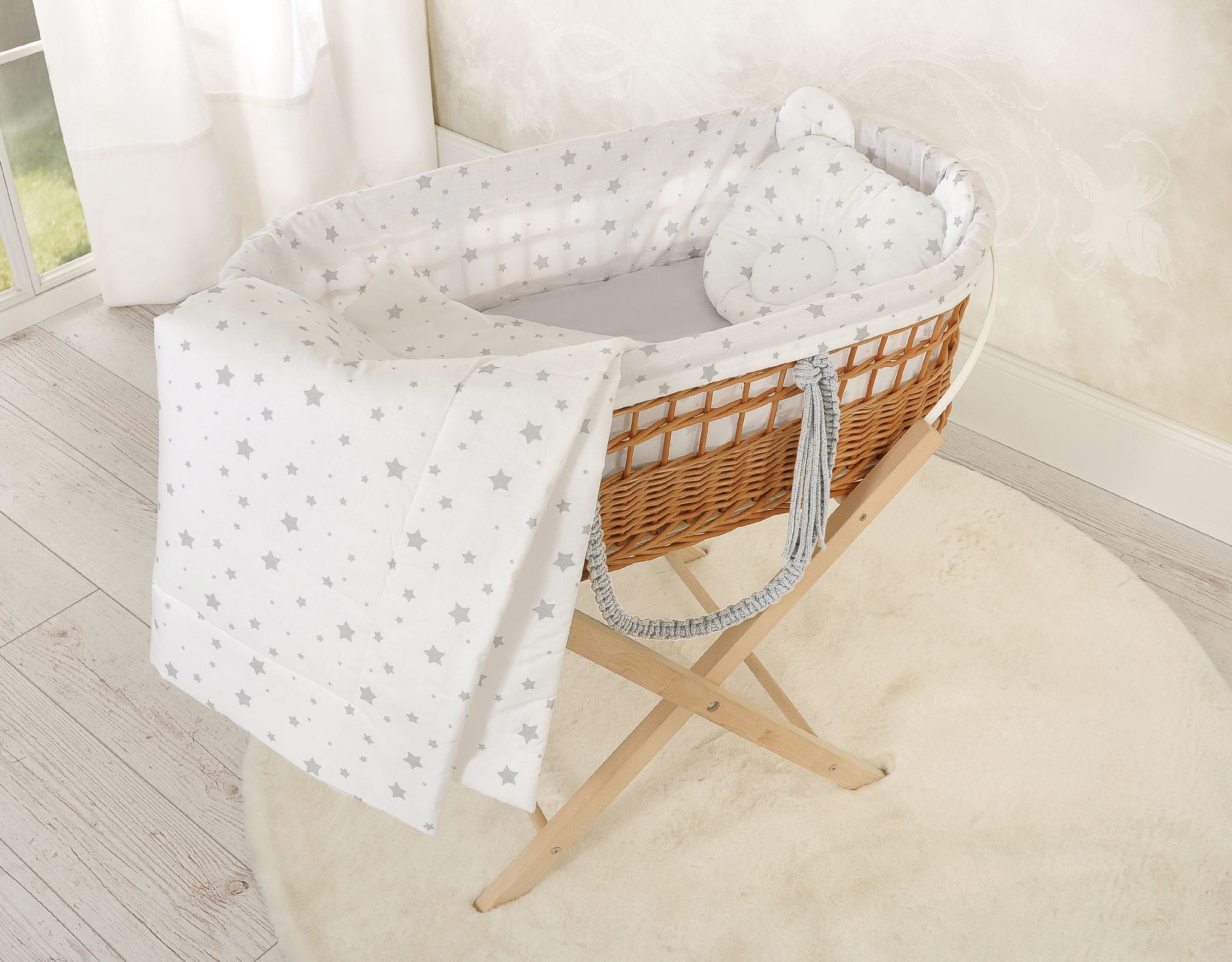 Kosz mojżesza BOHO wiklinowy z wyściółką bawełnianą - mini gwiazdki szare
