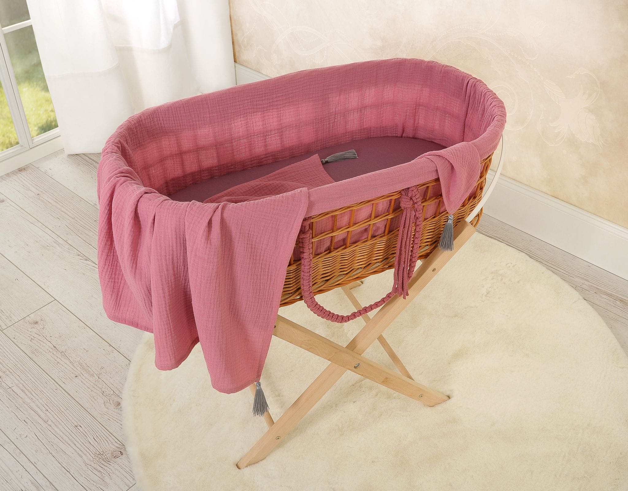 Kosz mojżesza BOHO wiklinowy z wyściółką muślinową - róż retro