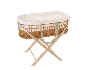 W zestawie: wiklinowy kosz Mojżesza z wyściółką, materacyk PREMIUM, drewniany stelaż do kosza.