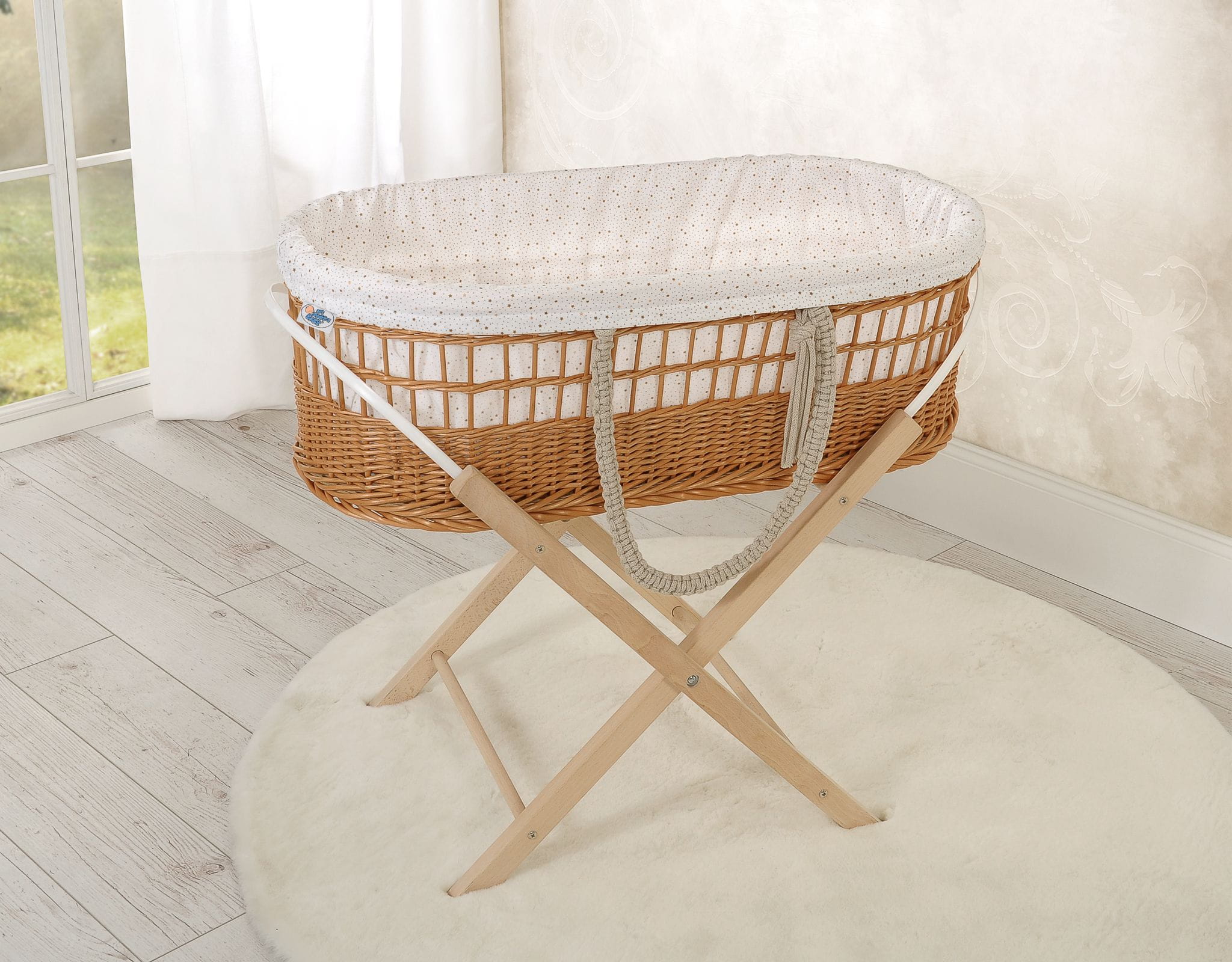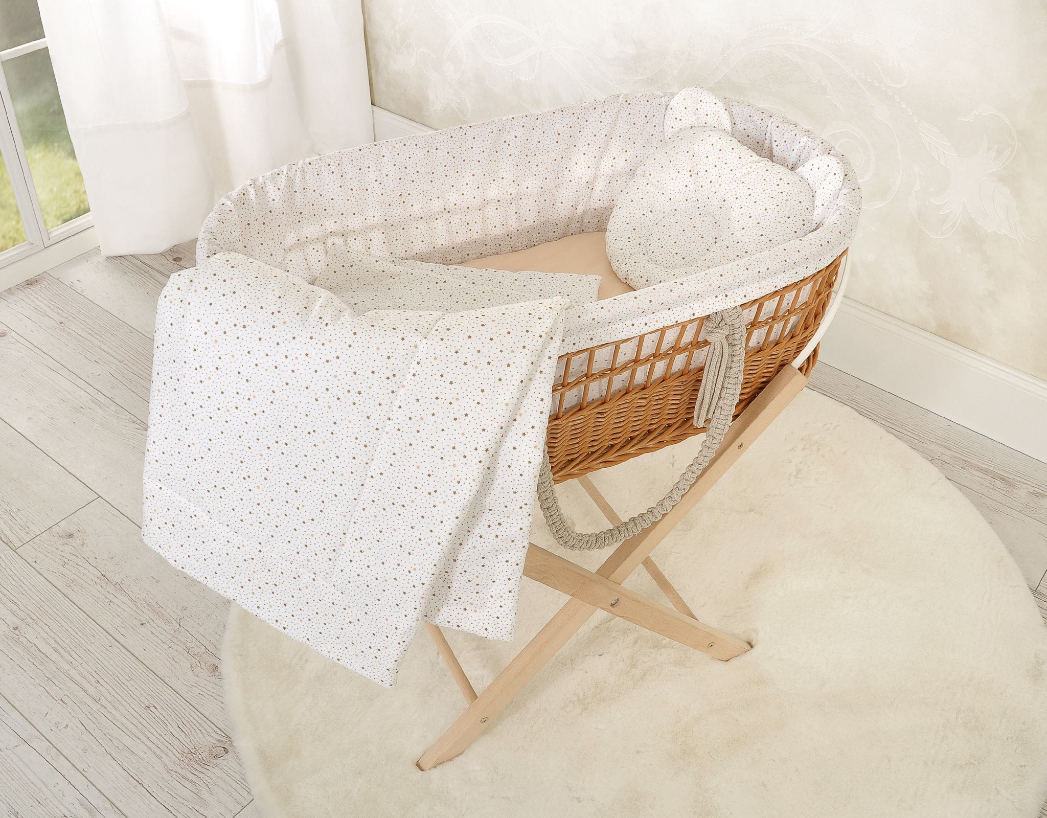 Kosz mojżesza BOHO wiklinowy ze stojakiem z wyściółką bawełnianą - mini gwiazdki złote